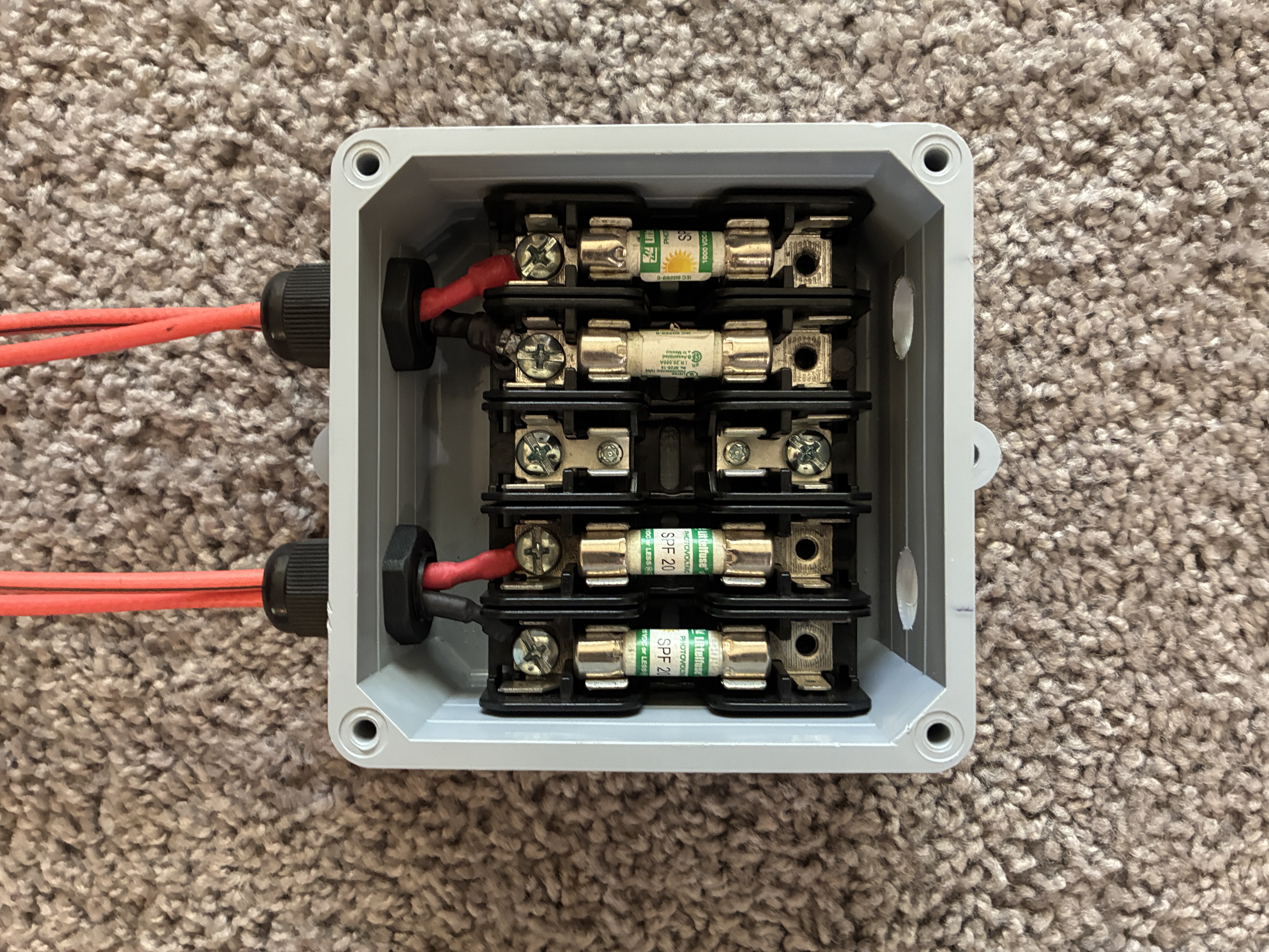 so our Mission should we choose to accept it, is to take 'em four free range Bussmann BMM603-xSQ 600V 30A fuse holders and shove them in a CANTEX box, now you don't have to fuse both sides, ie the negative and positive leads of say the onboard battery charger and or the DC-DC converter, I happen to done did that just to use the fuse blocks as junction blocks to allow me to extend the cables