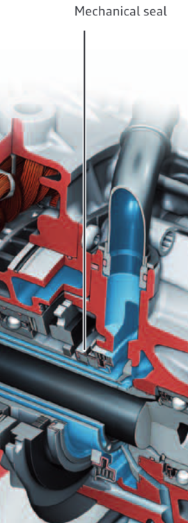 One diagram shows the motor (1 of 3, looks like not exact same design) uses 2 slip ring seal (presumably PTFE) on both sides of the rotor shaft coolant tube. Don't know if that has better longevity. The motor could also be unidirectional if gear box provides reverse. This would probably give the seal better chance at preventing leak.