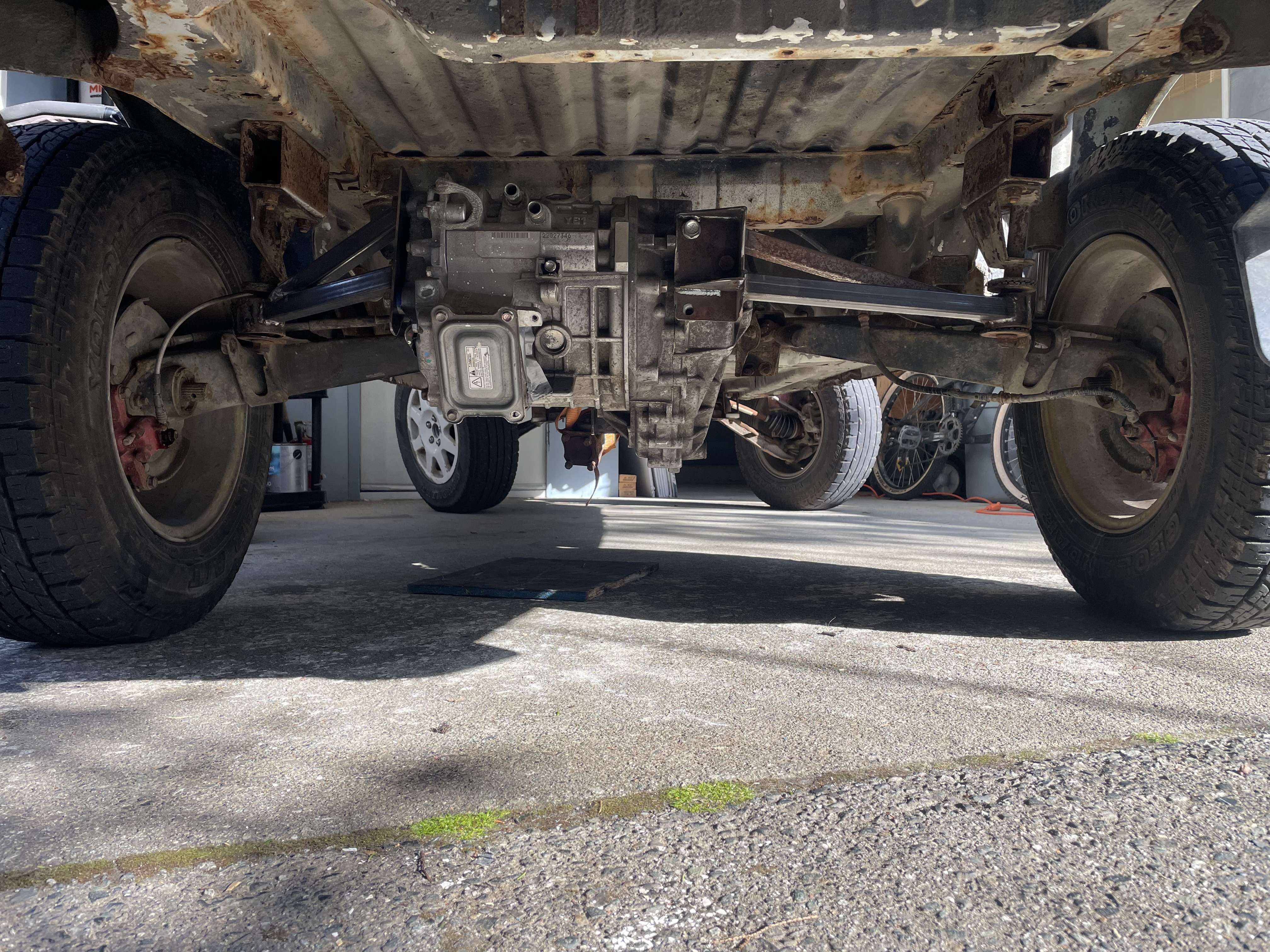 Built a jig and welded up the new mounts remotely and then brought the parts to the brat. not perfect but it’s in. Next up axles, then I can pull the original gearbox and leaf motor and loose a couple hundred lbs!