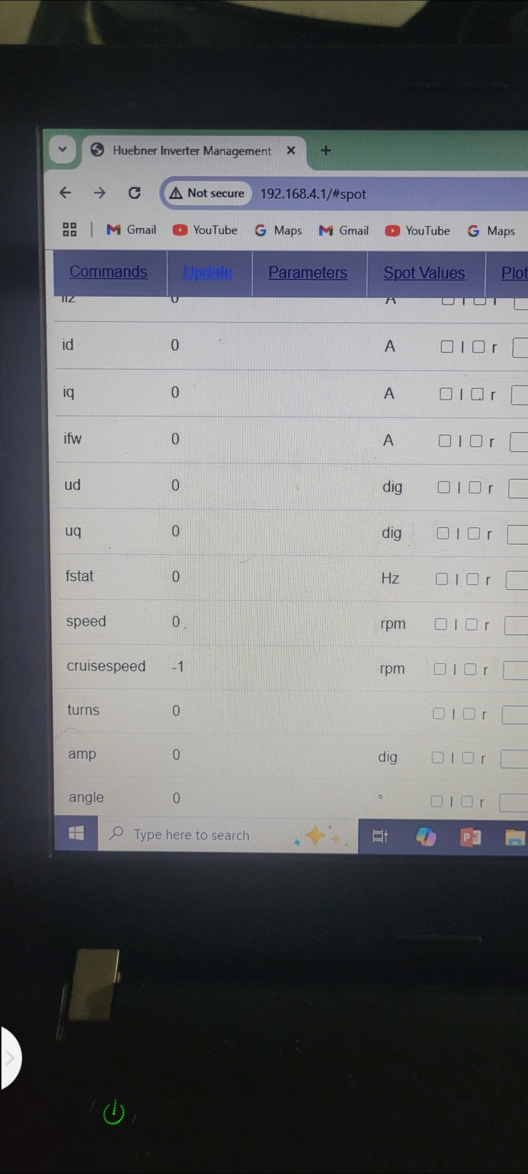 Then after I connected the resolver and shortly after setting udcsw to 0, the light bulbs turn on and they stay lit. This time around they don't blink but they say lit. When testing with a scope the PWM wave shows but it doesn't move. It stays in one position. On angle under spot values the angle was 239 degrees but kept changing by a value of 1 either increasing or decreasing when I pressed refresh even without turning the drive shaft.