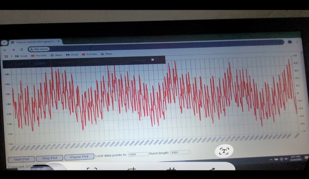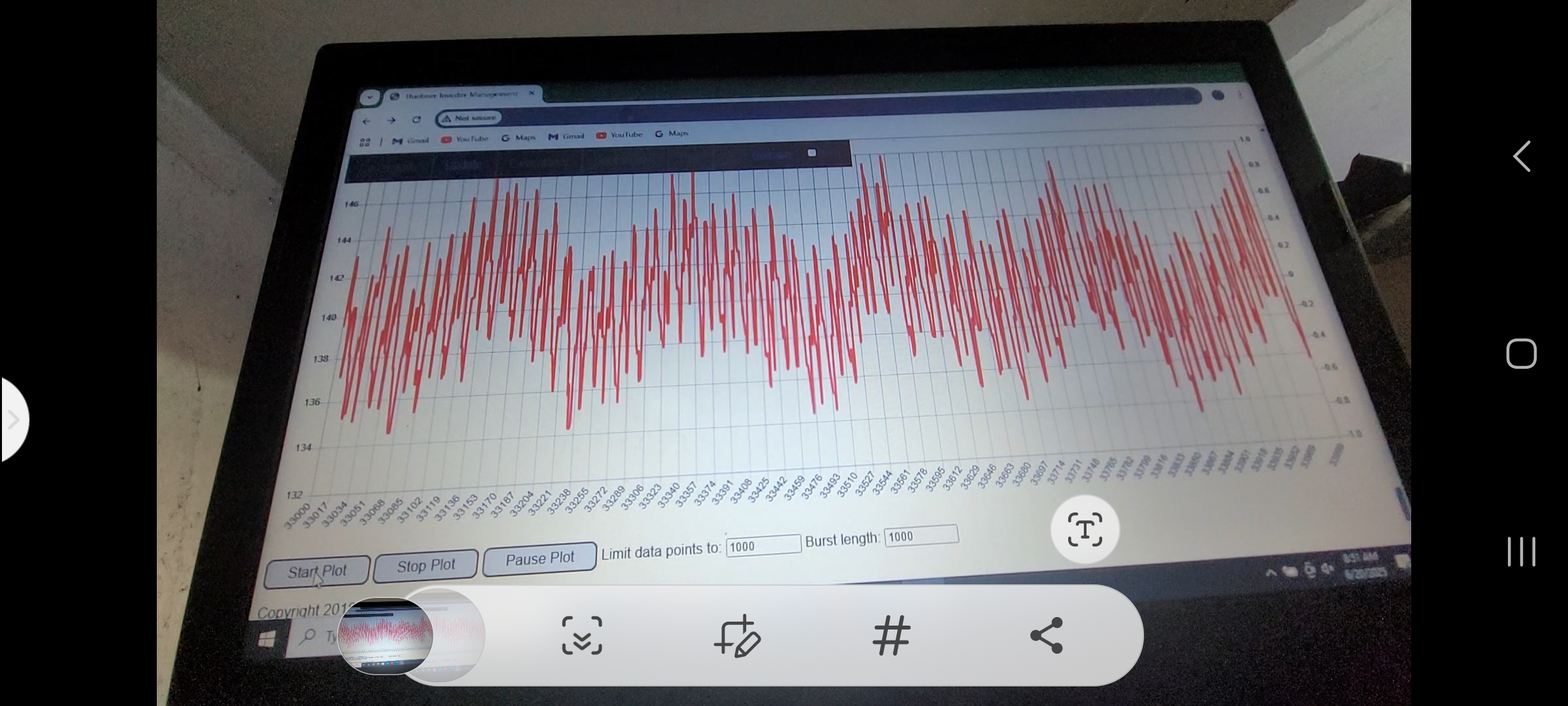 Also try completely disconnecting the phase cables and check if you get a steady 0-360 sawtooth pattern when turning the shaft by hand. Plot setting is burst length 1000, data points 1000