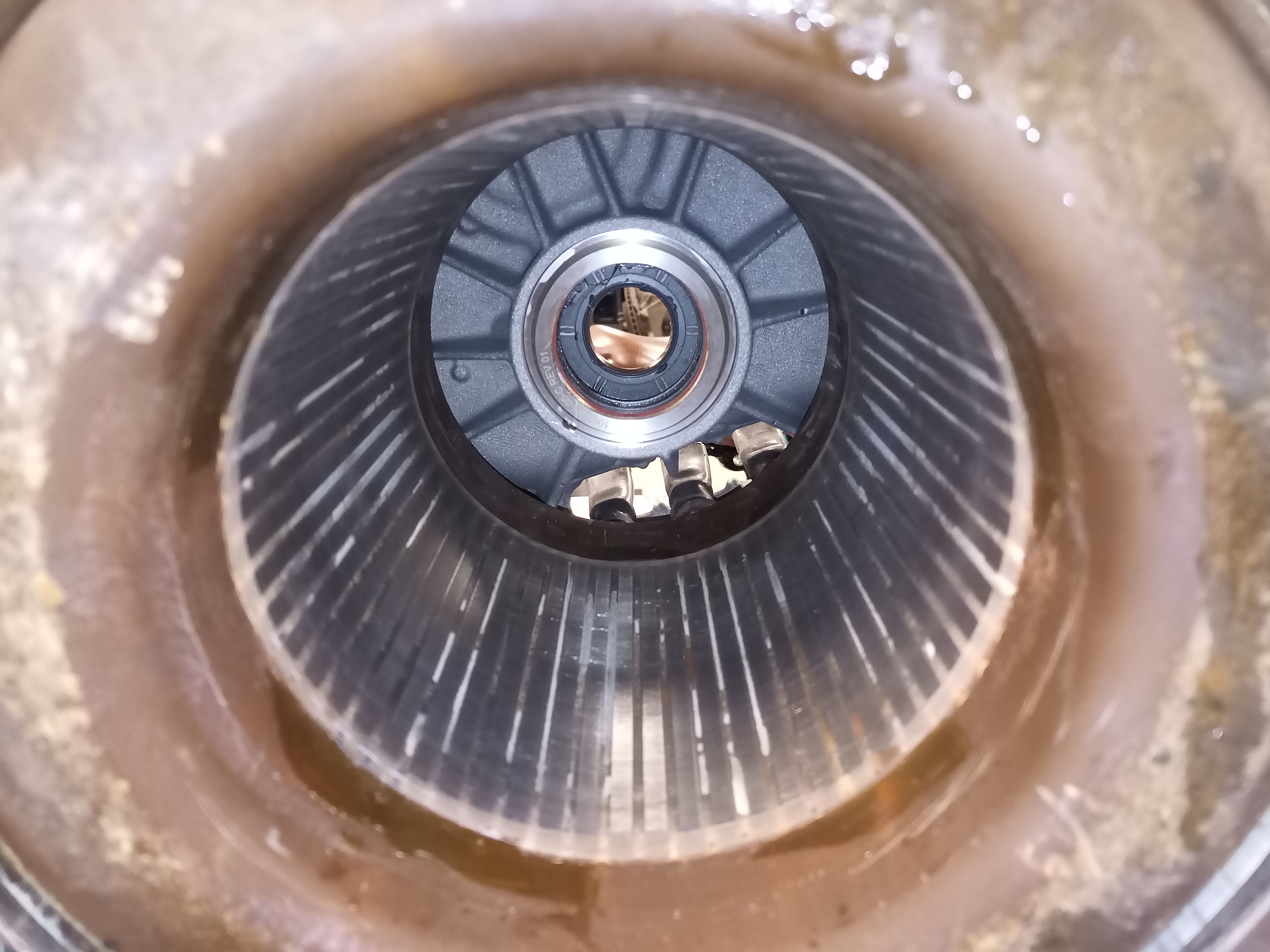 This seems to be a really interesting failure pattern without the vent hole. This is just conjecture looking at the failure pattern. Aerosolized coolant by the reluctor agitator can't get into the motor without speed sensor vent hole. So it goes through the bearing and condenses. Rotor has no agitator so coolant sits on the motor side soaking on the winding varnish without ever making it to the inverter side.