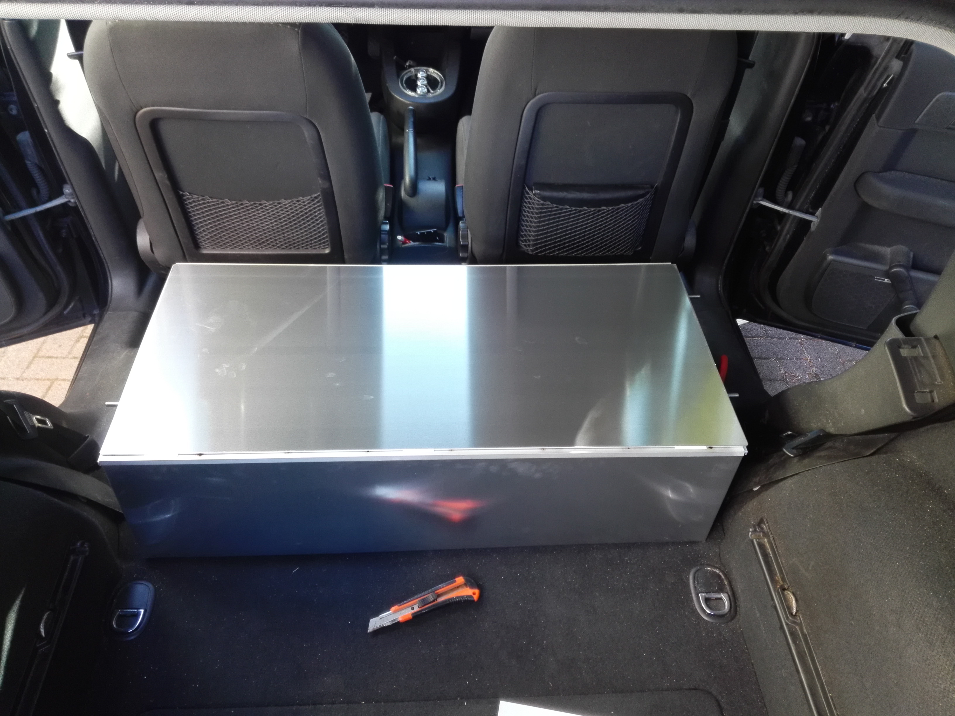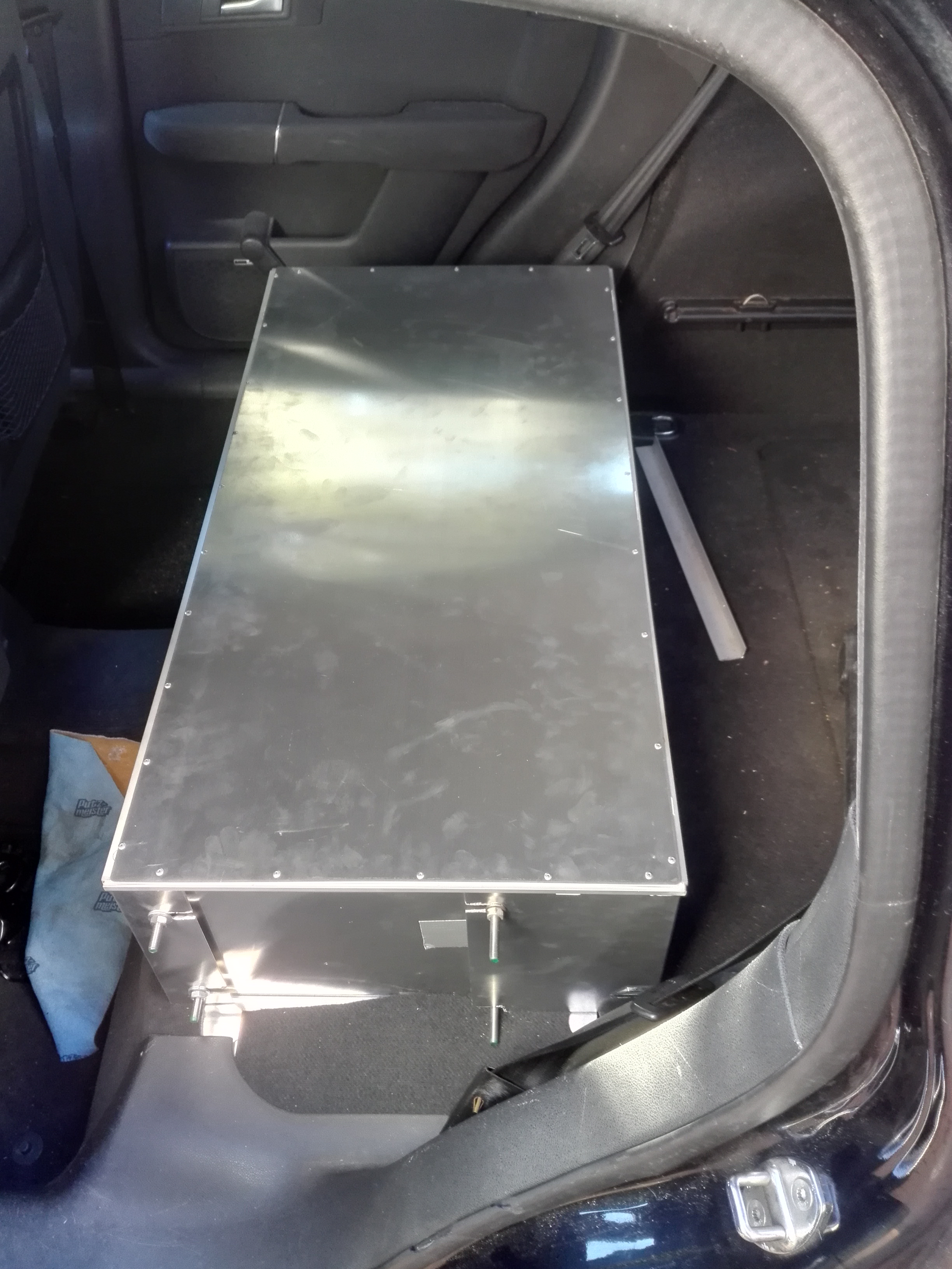 Battery box is coming along nicely. I divided the carpet, the outer parts extend to the front of the box to where they were before. The inner pat folds over contactors, fuse etc. to isolate those from the metal box