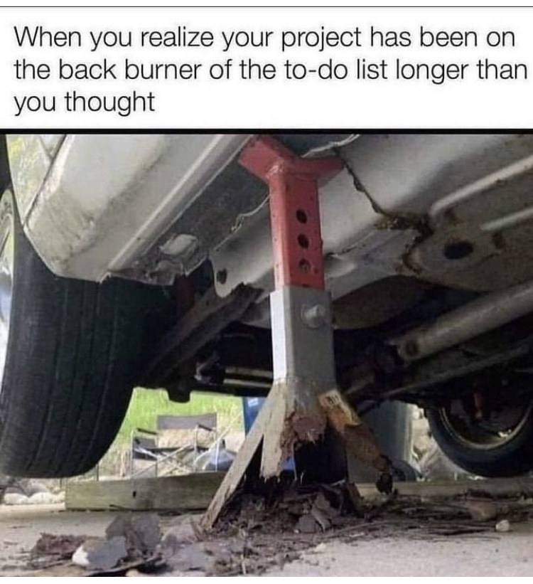 I think the biggest obstacle I have is, this is exactly my personality type. The brief moments of inspiration where I just want to go get a tiny thing done right now. Maybe that's one hole, maybe it balloons into an all-nighter. But it starts off with the motivation to just take a bite. And, since I don't have my own garage, my motivation is cut off at the legs. It has to be an event to even start working. For a couple years I was in someone else's garage 30 minutes away, and even now, it's in the parkade, but, I have to be discrete. It's under a car cover, I can't make much noise, I can't leave tools and parts out when I need a break (they'll get noticed or stolen), it still has to be car-shaped and under the cover when I'm done for the day. So doing 30 seconds of work takes 45 minutes of setup and teardown. I don't often feel like doing 45 minutes of work, especially if the first two or three things I try isn't the solution that's working and I need to pause.