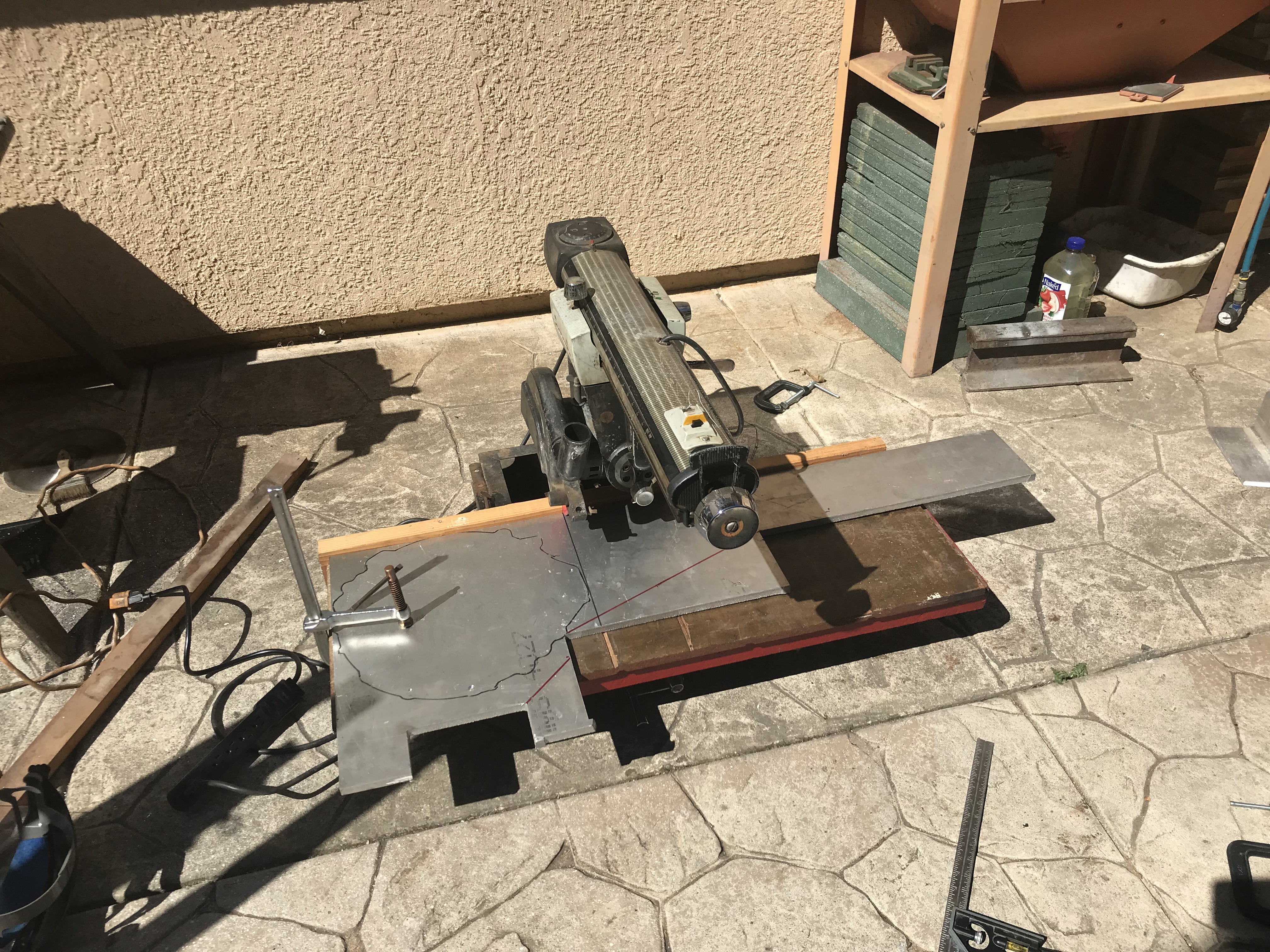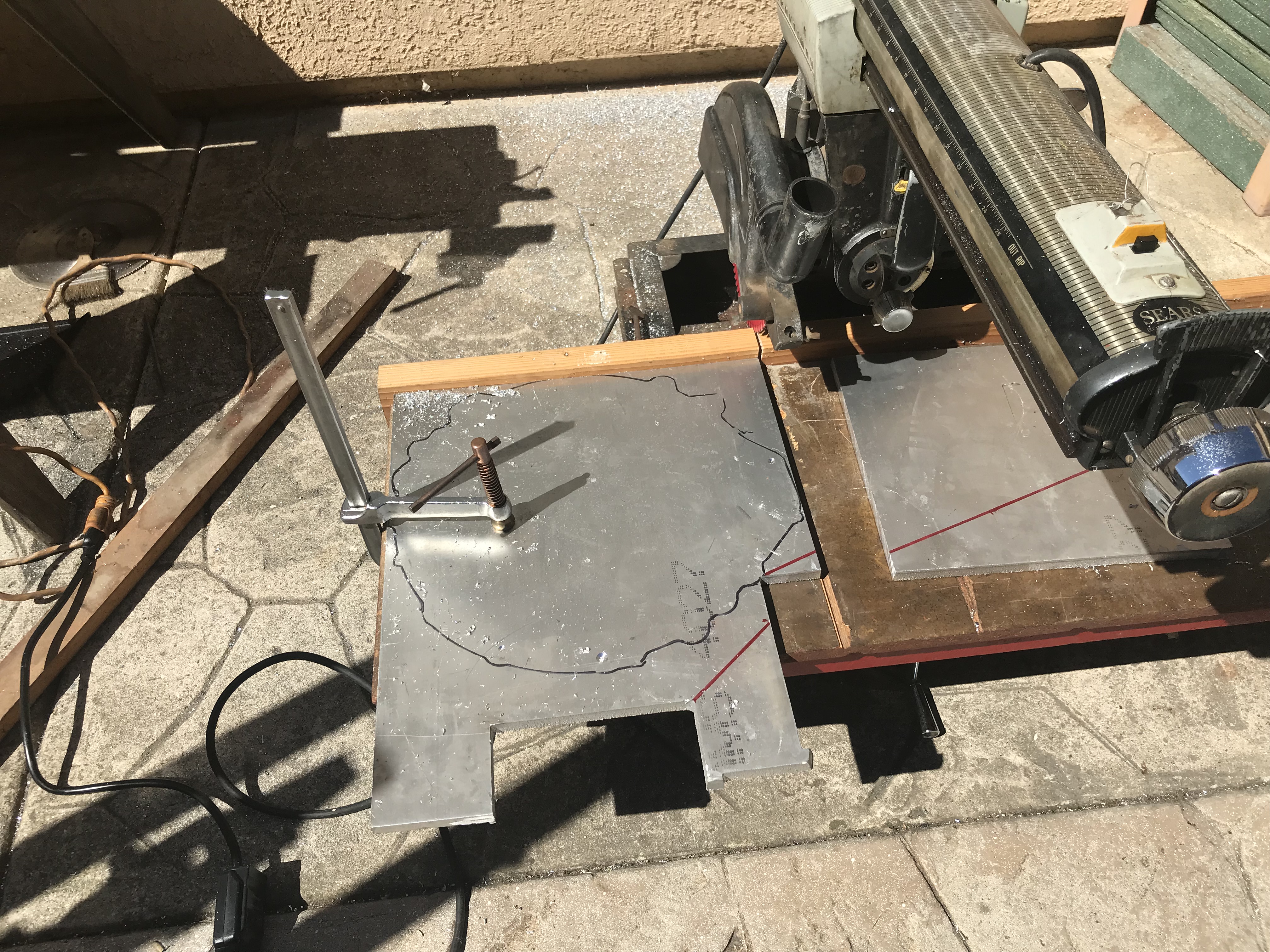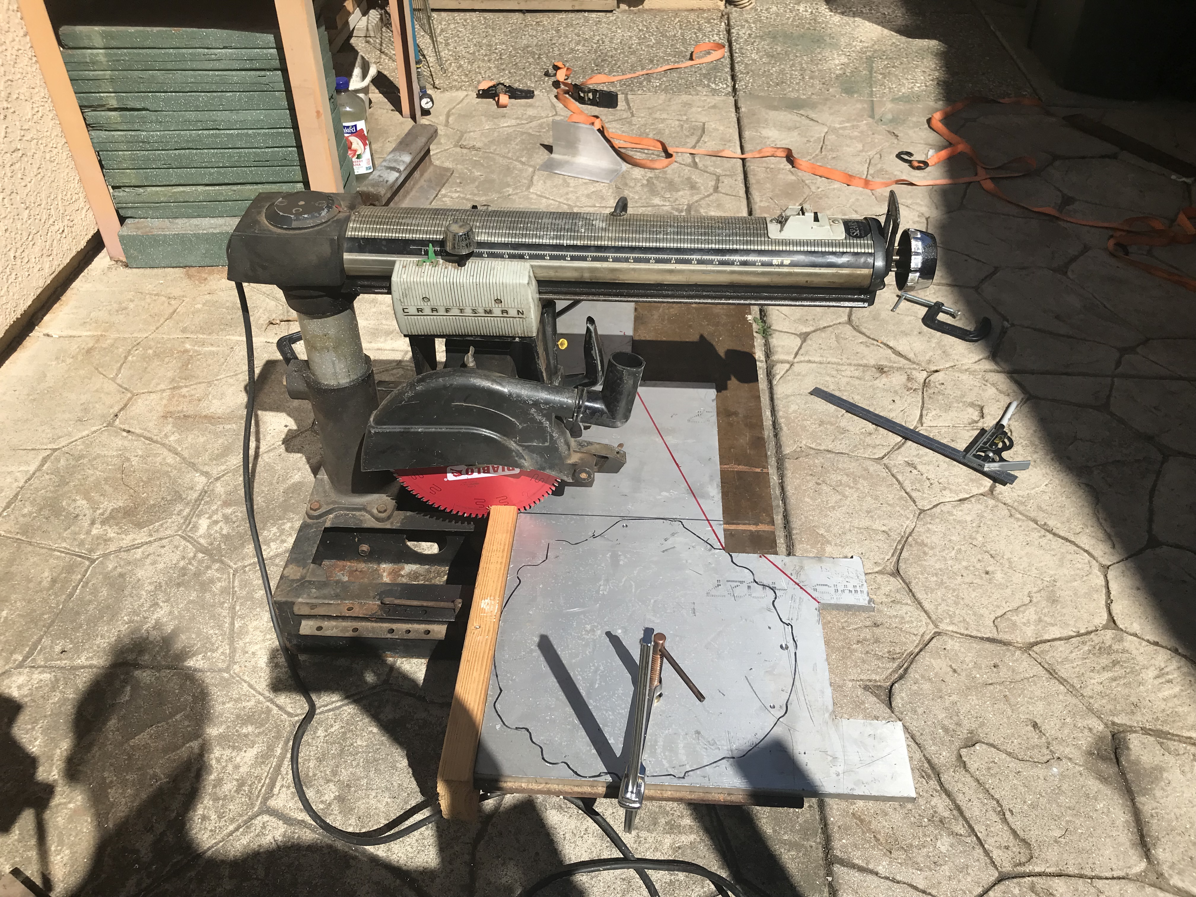 cutting 1/2" aluminum plate a mil at a time using my FREE Craigslist Craftsman Radial 10" saw with a Diablo 84 tooth non stick blade, yeah baby