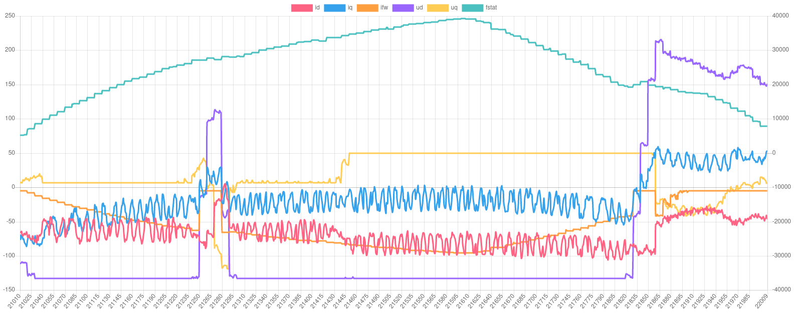 Been thinking a bit more about this and the best plot for checking the interaction of uq, ud, iq and id would be one showing them, plus frq, while coasting (no regen, no throttle, target of 0A for id and iq) down from just below base frequency.