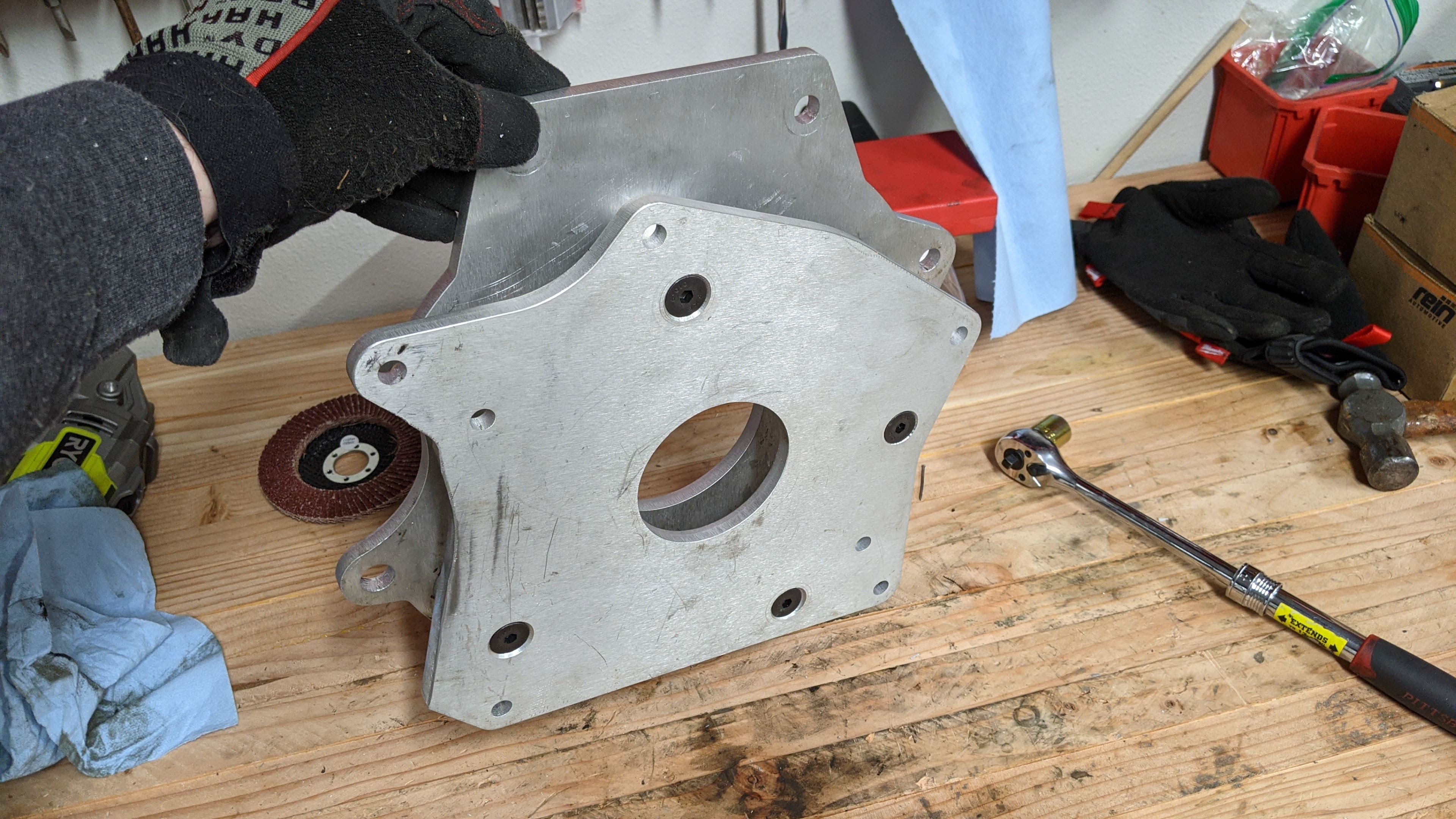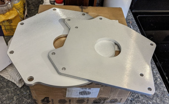 Why do I have 2 adapter plates you ask? because i have to offset the transmission from the Leaf EM57 due to the inverter overhang at the top. I want to keep the inverter mounted directly on the motor. Spacer size is TBD