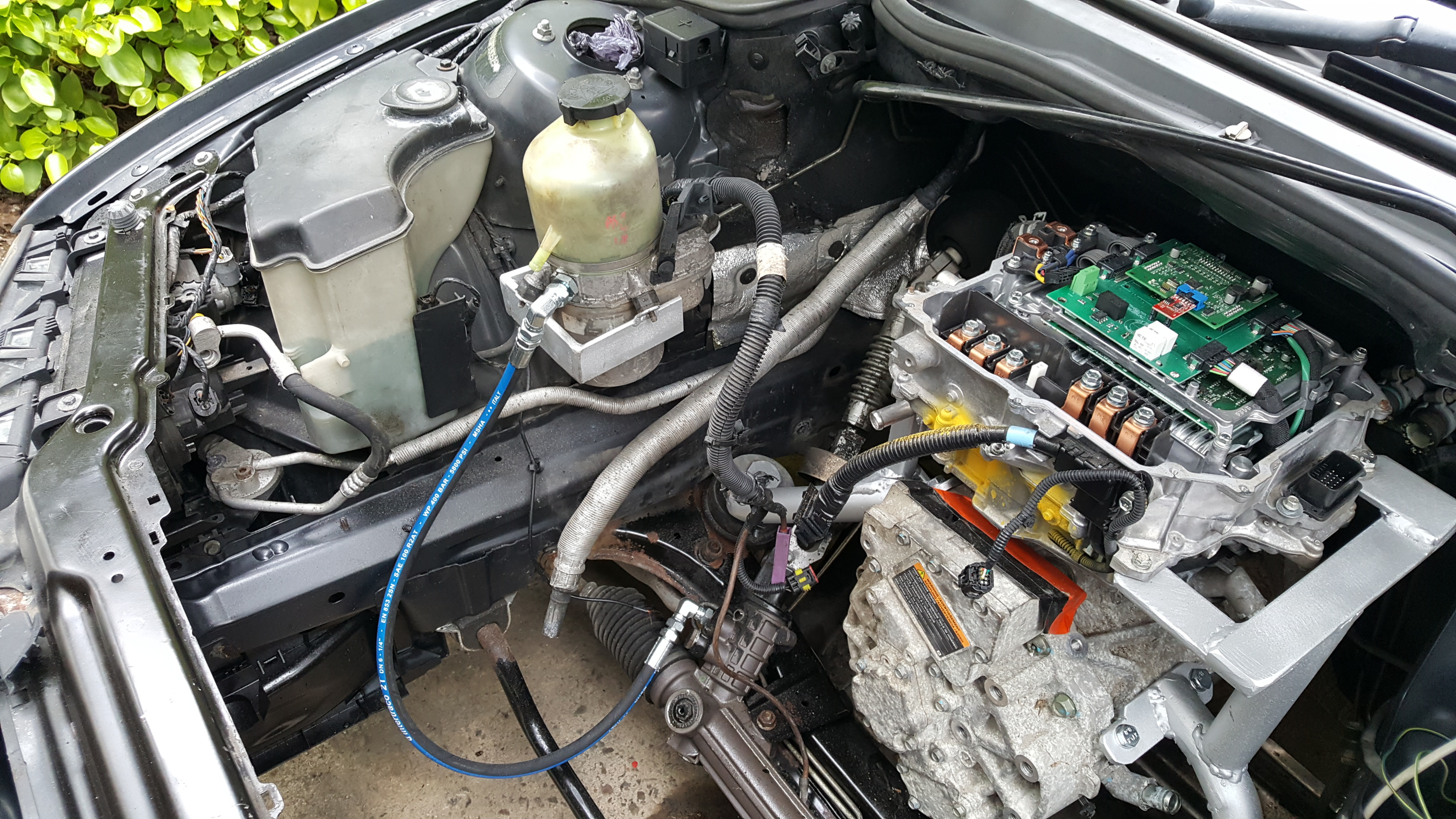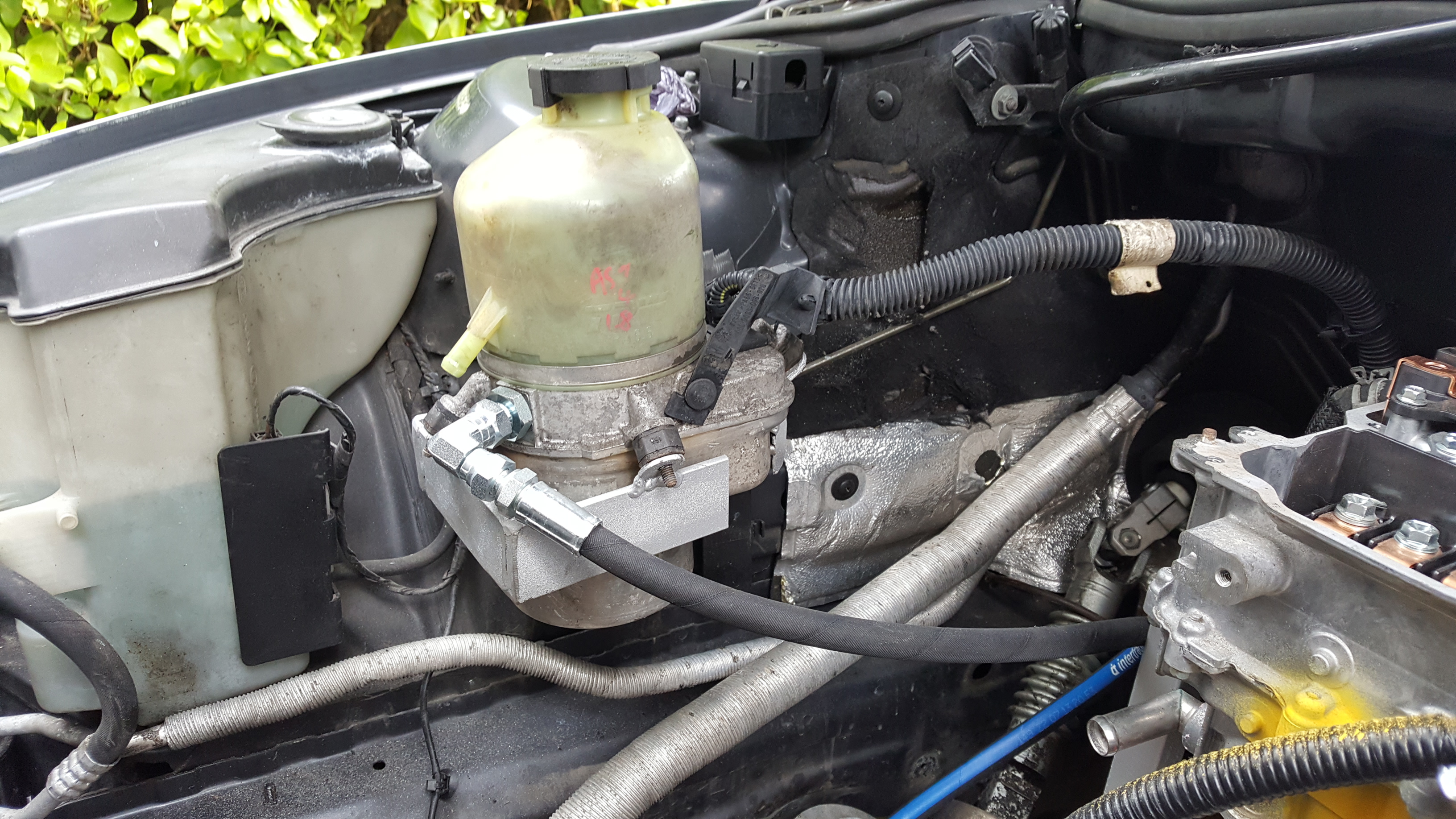 Motor mounts sanded and painted. Inverter mounts done. Power steering pump mounted and high pressure line in. All hail the Grey Goose