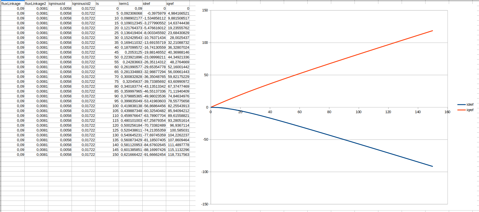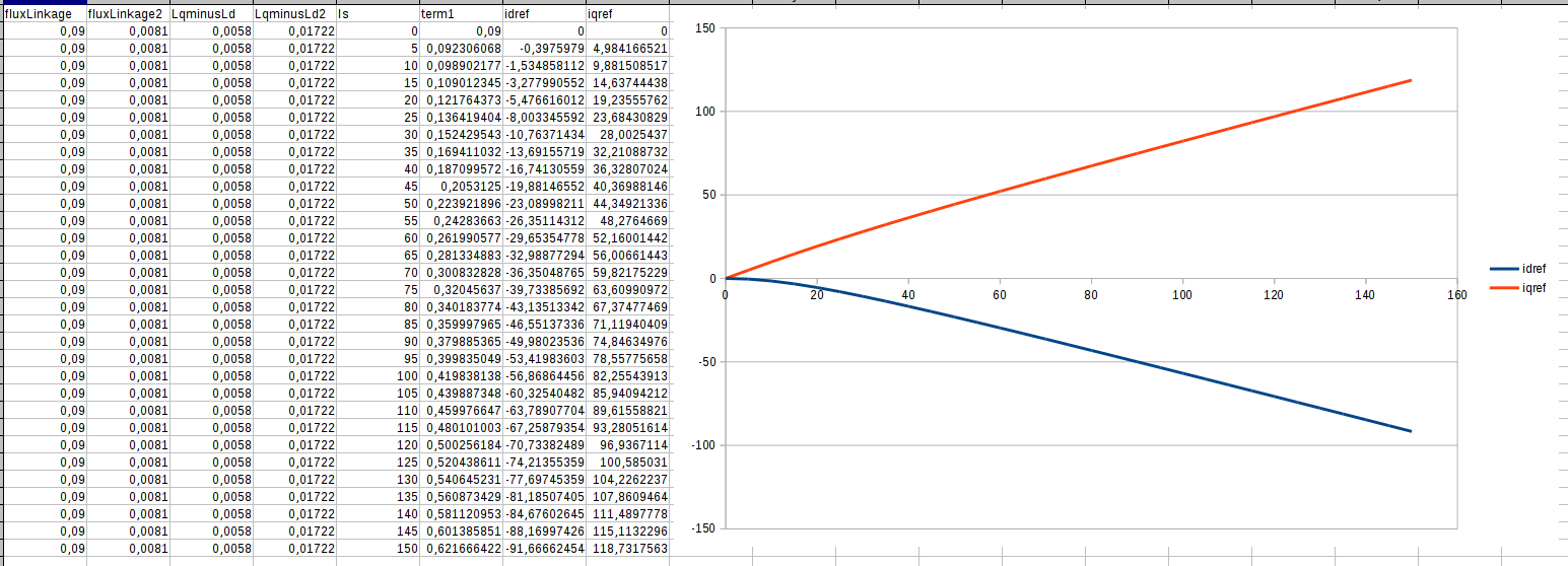 celeron55 wrote: Sun Jun 13, 2021 9:59 am I'm playing with the MTPA calculation in LibreOffice and it looks like you can make a 10x adjustment and it only makes a 2x difference in output. So going really wild with these will make sense. Something along the lines of 10x IqminusId or 0.1x fluxLinkage will definitely cause more Id than Iq. But 2x or 0.5x respectively might have no discernable effect.