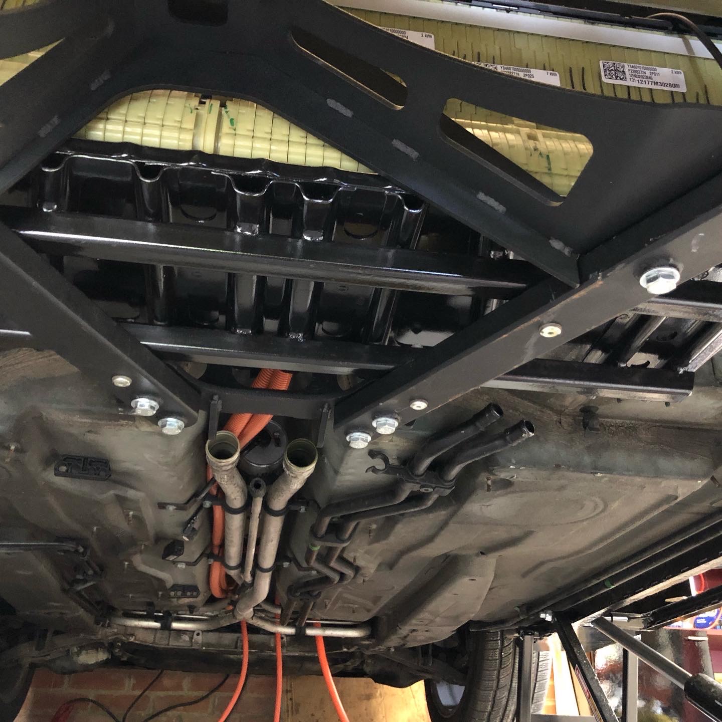 The weight of the Tesla drive unit and battery bank that the frame system is supporting is connected to the bolt holes of the original front engine mount (and rear mounts). The whole system is still less than 100kg lighter than what the same bolt holes were supporting with the OEM ICE.