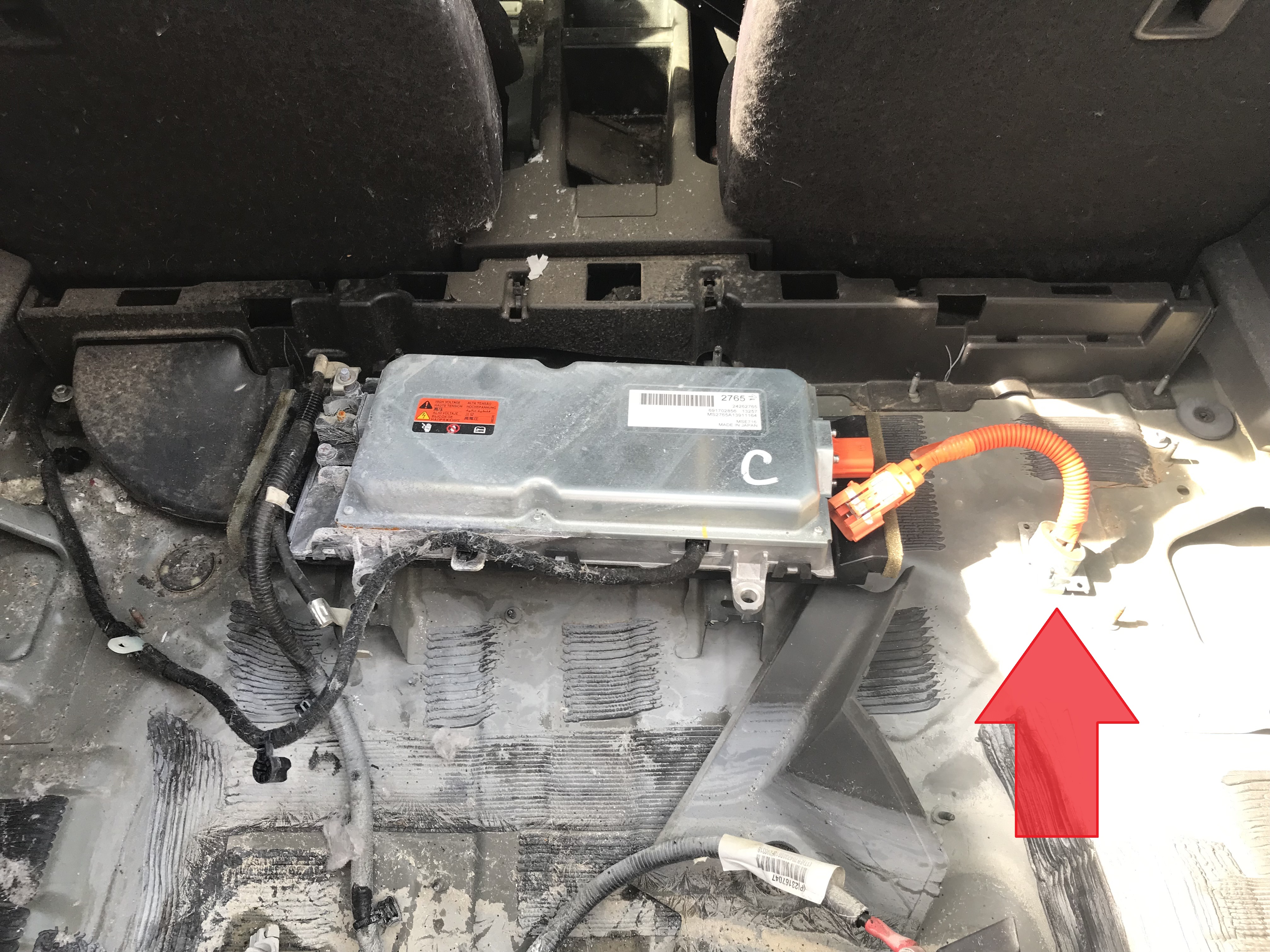 below we see just the tail end of a much much longer high voltage cable that connects the DC-DC converter in the trunk of the vehicle to the front of the battery pack right below the engine firewall, using a high voltage cable encased in a metal tube