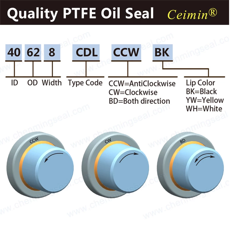 The CTLBDYW = triple seal, both directions & yellow - which must be CM-3965 above.Ceimin® PTFE sealing lips are PTFE compound discs that are mechanically formed to a diameter slightly smaller than the shaft. The forming of the lip creats a shape that takes advantage of the hoop strength of the PTFE compound discs. This hoop strength provides the load that is critical for low or no pressure applications to obtain a positive seal.