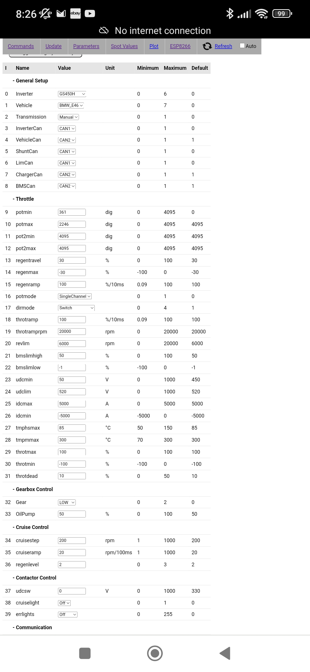 Output spins freely and gear selector in Drive.nkiernan wrote: ↑Fri Dec 08, 2023 7:54 am Is the actual gearbox gear selector in a neutral position (R-N-D) and not in park position so output is free to rotate? In spot values, I presume OpMode is showing as Run, but is Brake showing as Off and either Forward or Reverse showing as On when you're applying throttle to spin? Is LastErr or Status below it in spot values showing any message?