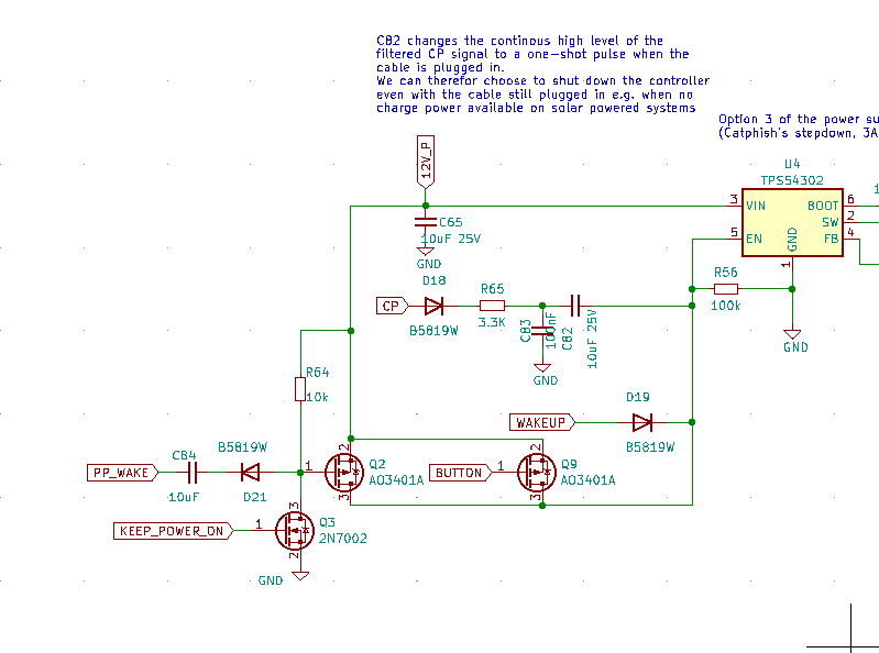 So quite simply an RC filtered CP will turn on the enable signal of the power converter. Likewise the 12V wakeup signal. PP on the other hand needs inversion, when PP goes low we turn power on. To not disturb resistance measurement with our 12V pull-up the latter is disabled once the MCU sets KEEP_POWER_ON.
