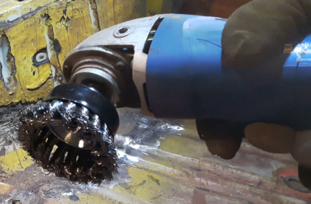 1 - Abrade it away with an aggressive wire wheel, then vacuum up the grains. This is what I did. Ugh: