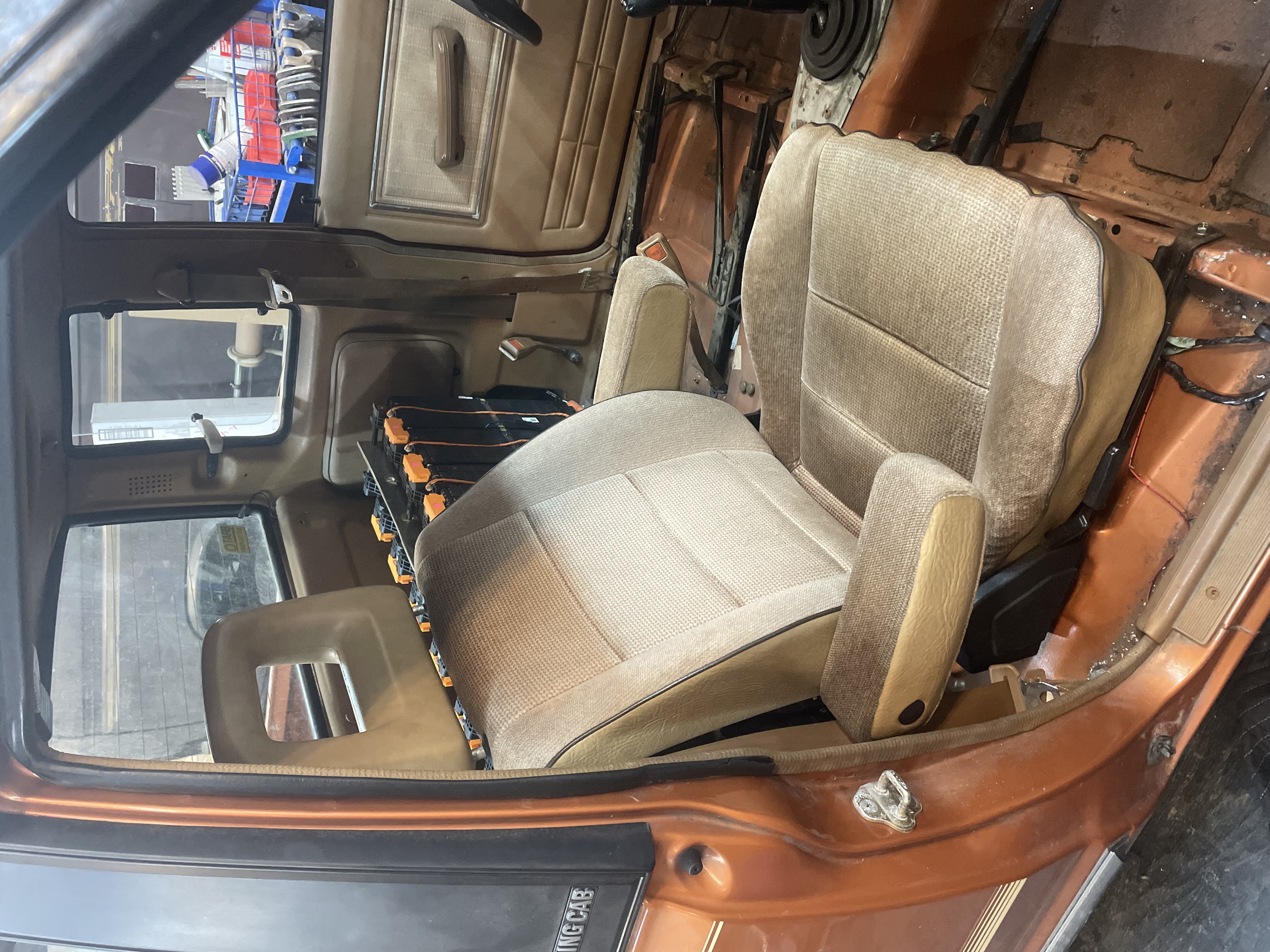 beige vanagon seats really matched the interior and look stock in the truck, so custom set brackets and a heated seat kit