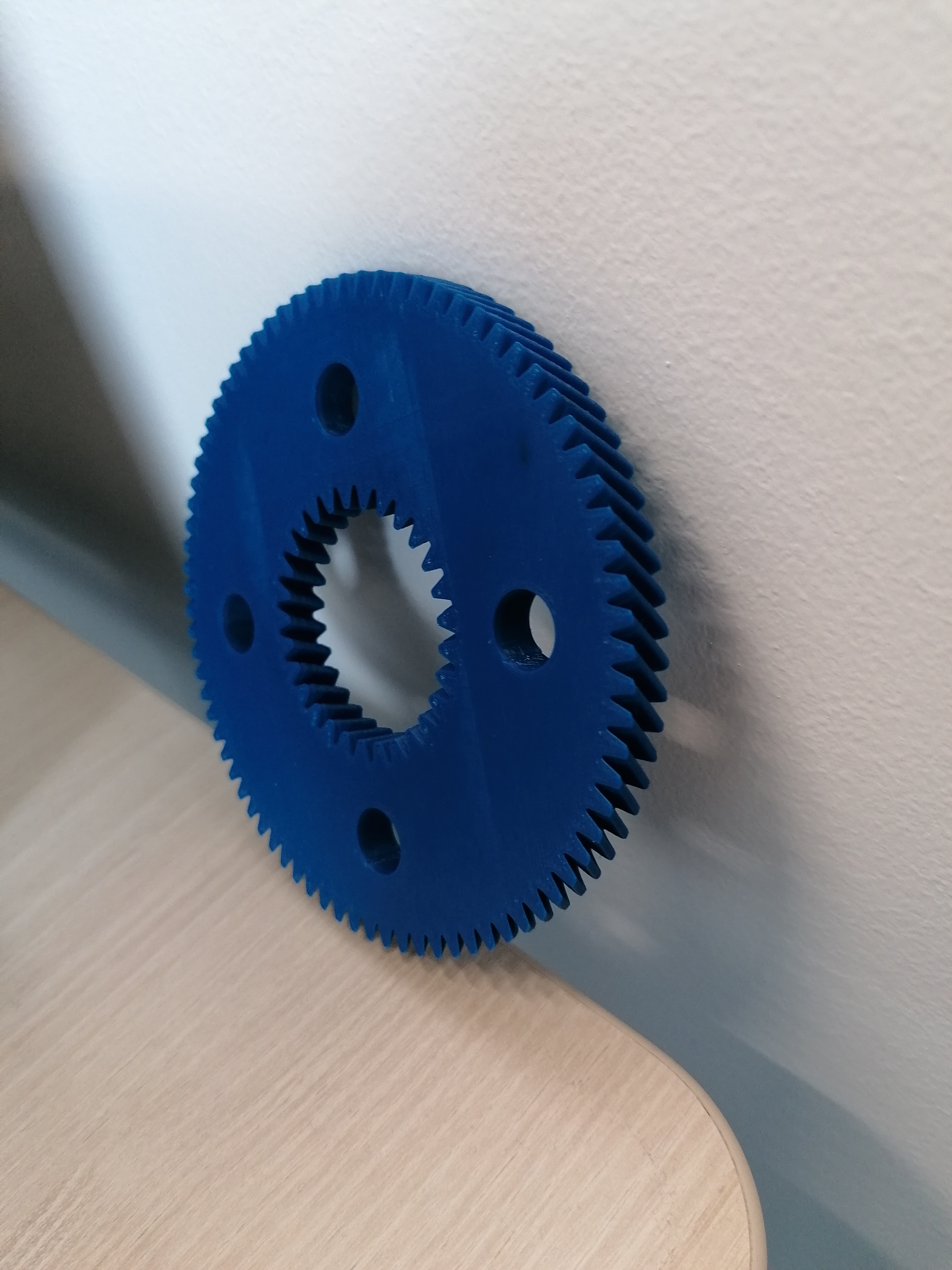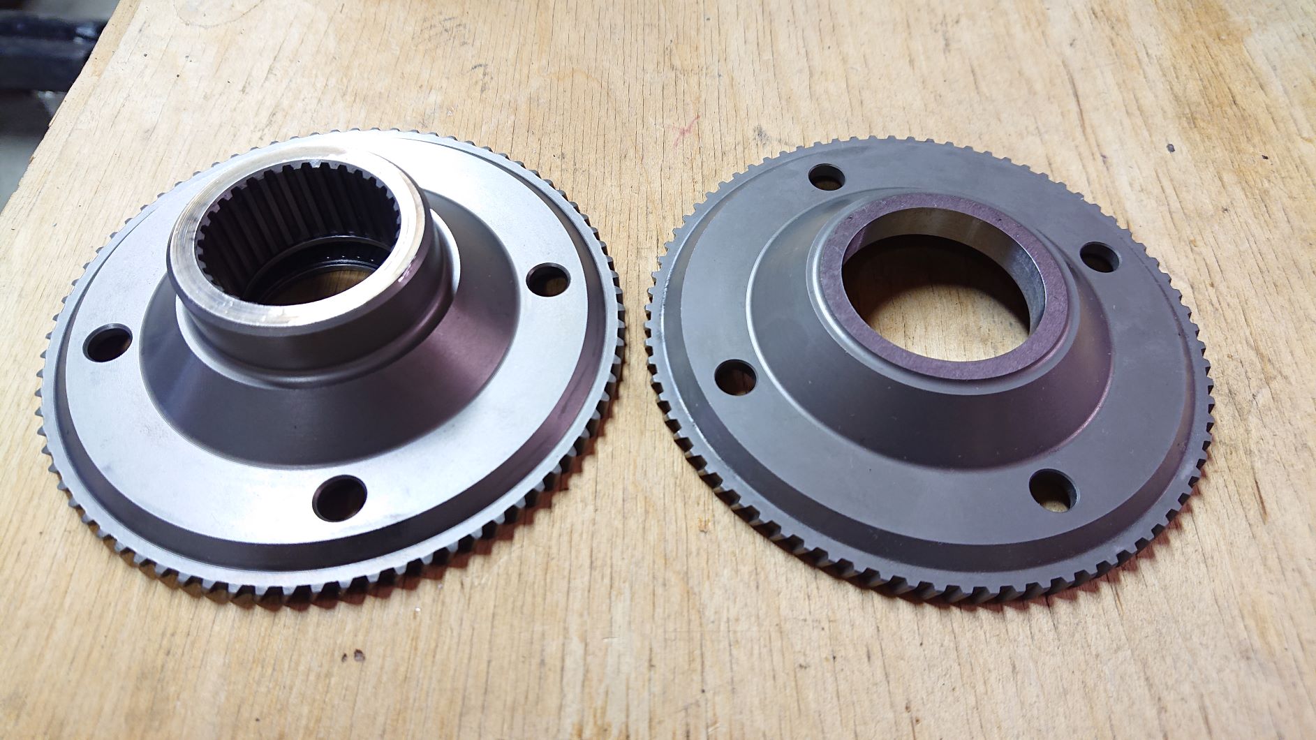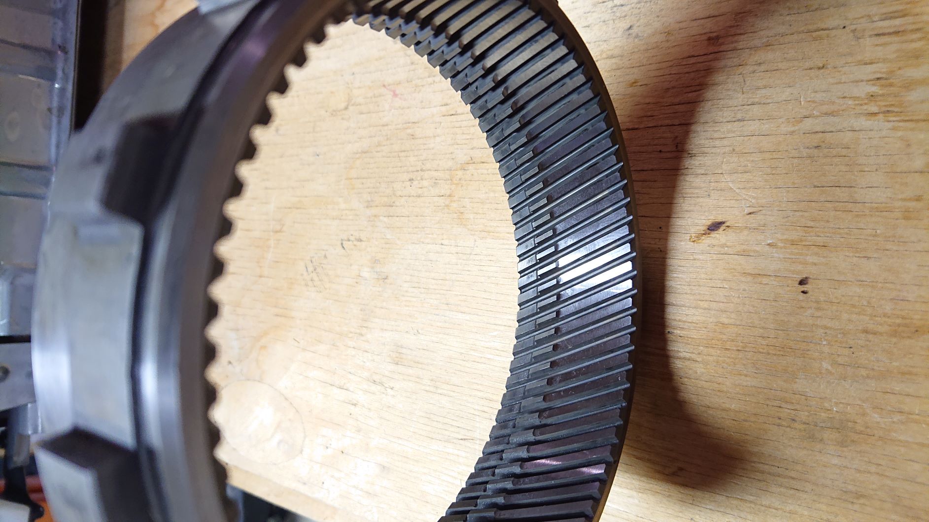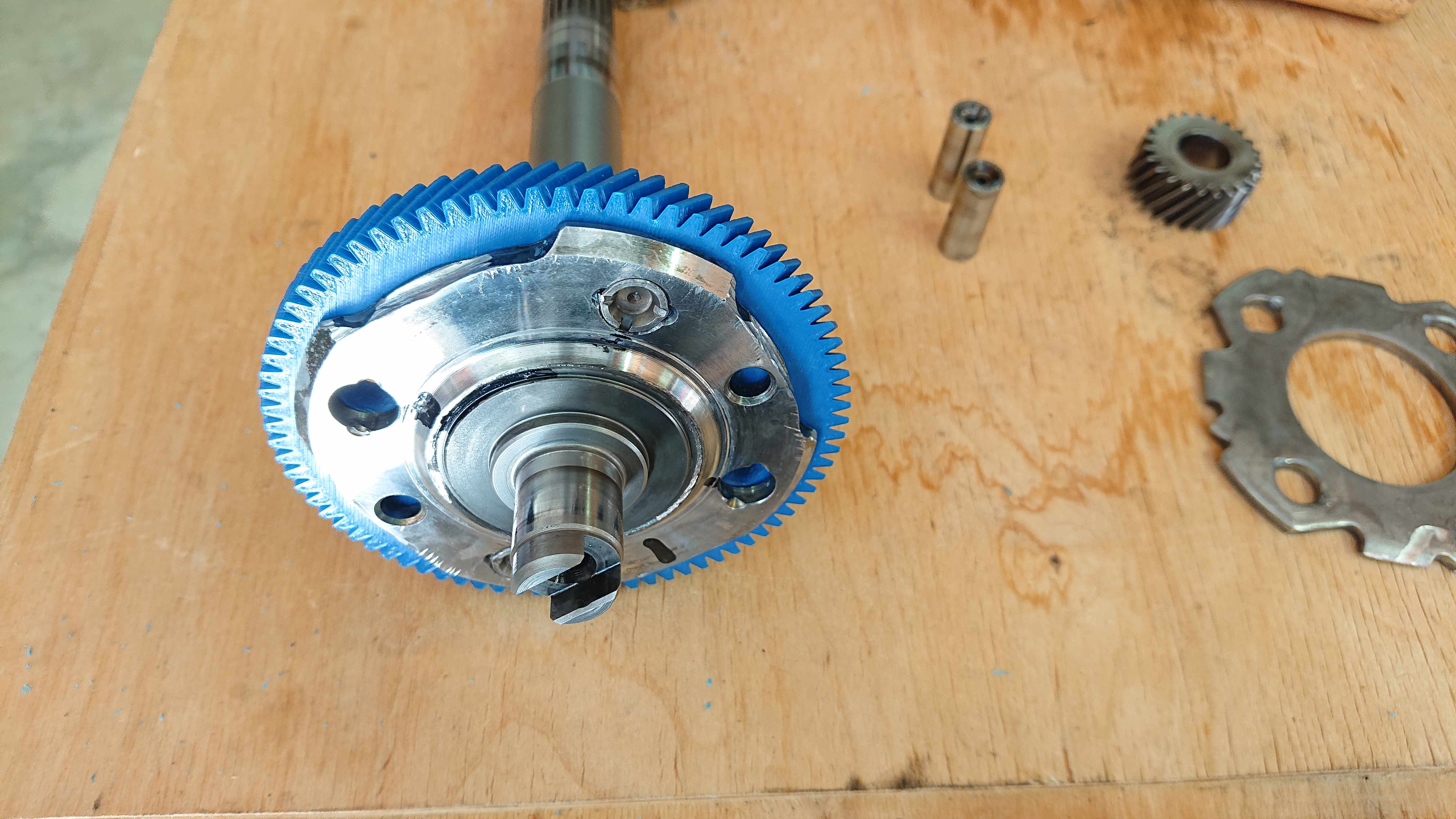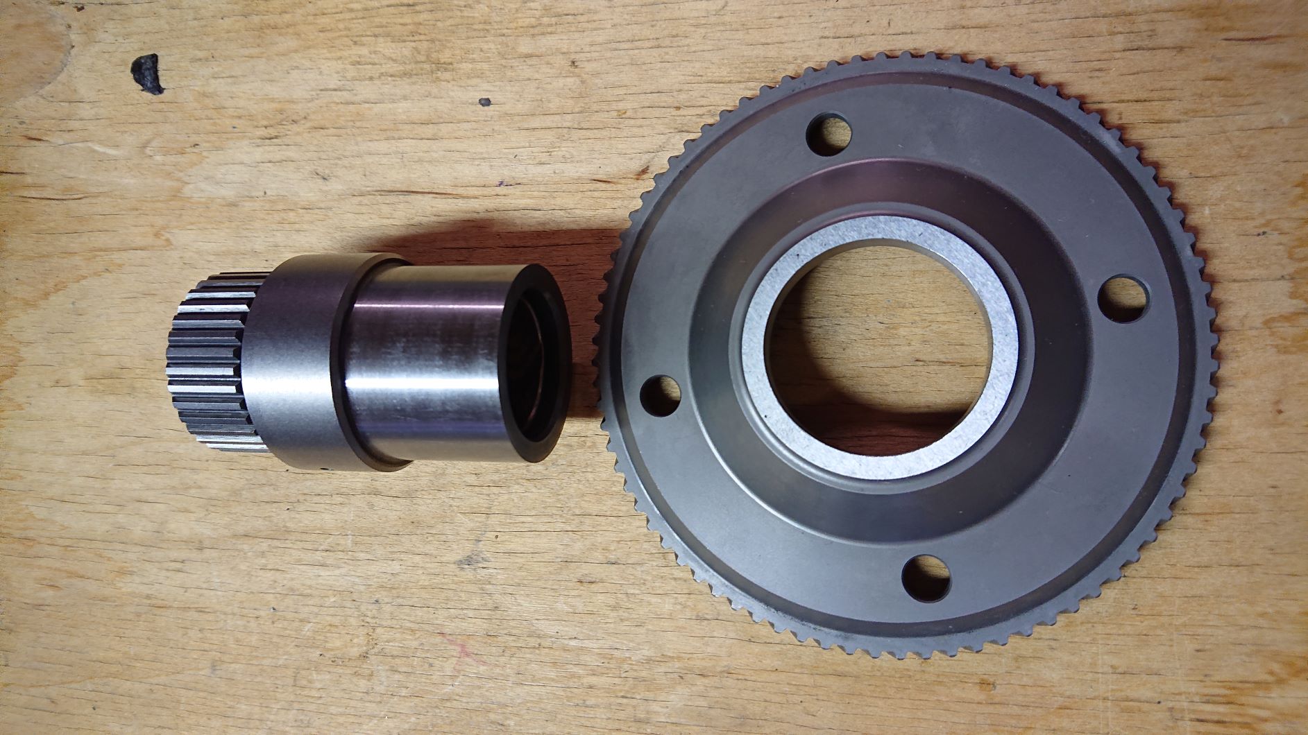 Mock up gear made. Remove planet gears and outer part of their cage is next. Measure thickness required for new part, to simply re-use original planet gear pins to secure a ring gear... More pics to come.