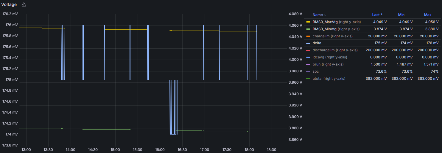 For visualization, I use Grafana to query the InfluxDB database. The setup handles a significant volume of data—for example, six BMS boards generate seven messages every 100 ms, amounting to nearly 2 million data points in a 6-hour chart. To manage this, the data is grouped during queries to reduce processing load. Zooming in fetches a smaller, more detailed dataset for the visible range.