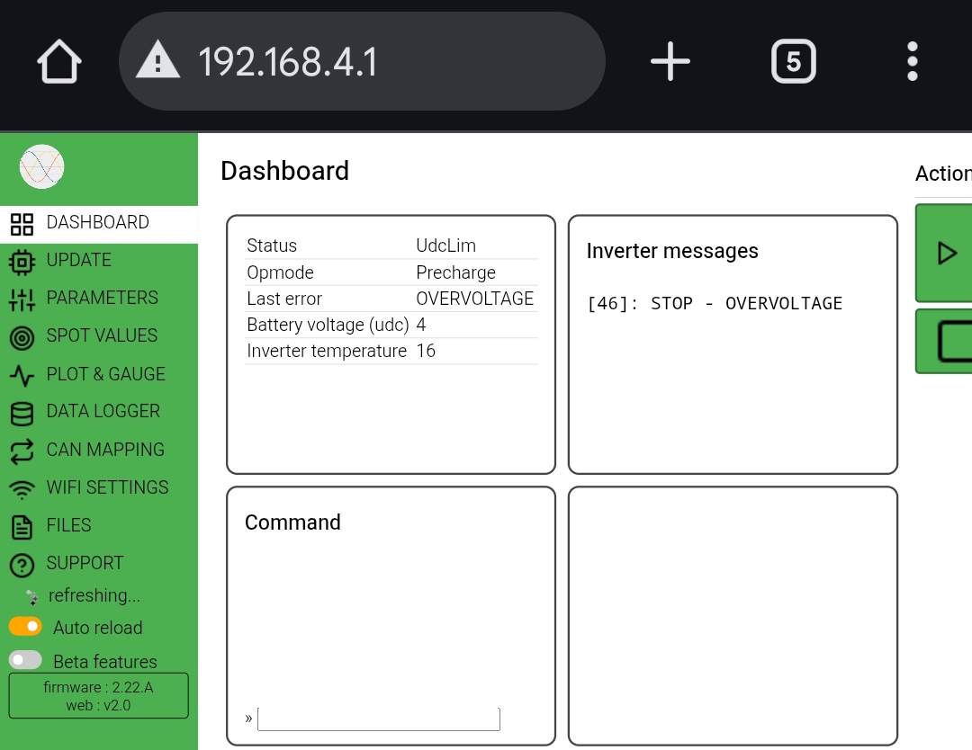 Battary 9 packeges of 6s2p (21700 liIon) near 200v, can discharge at 40 amp. In params i changed all to CAN1. Last test i recieved inverter error - [816] STOP - PRECHARGE