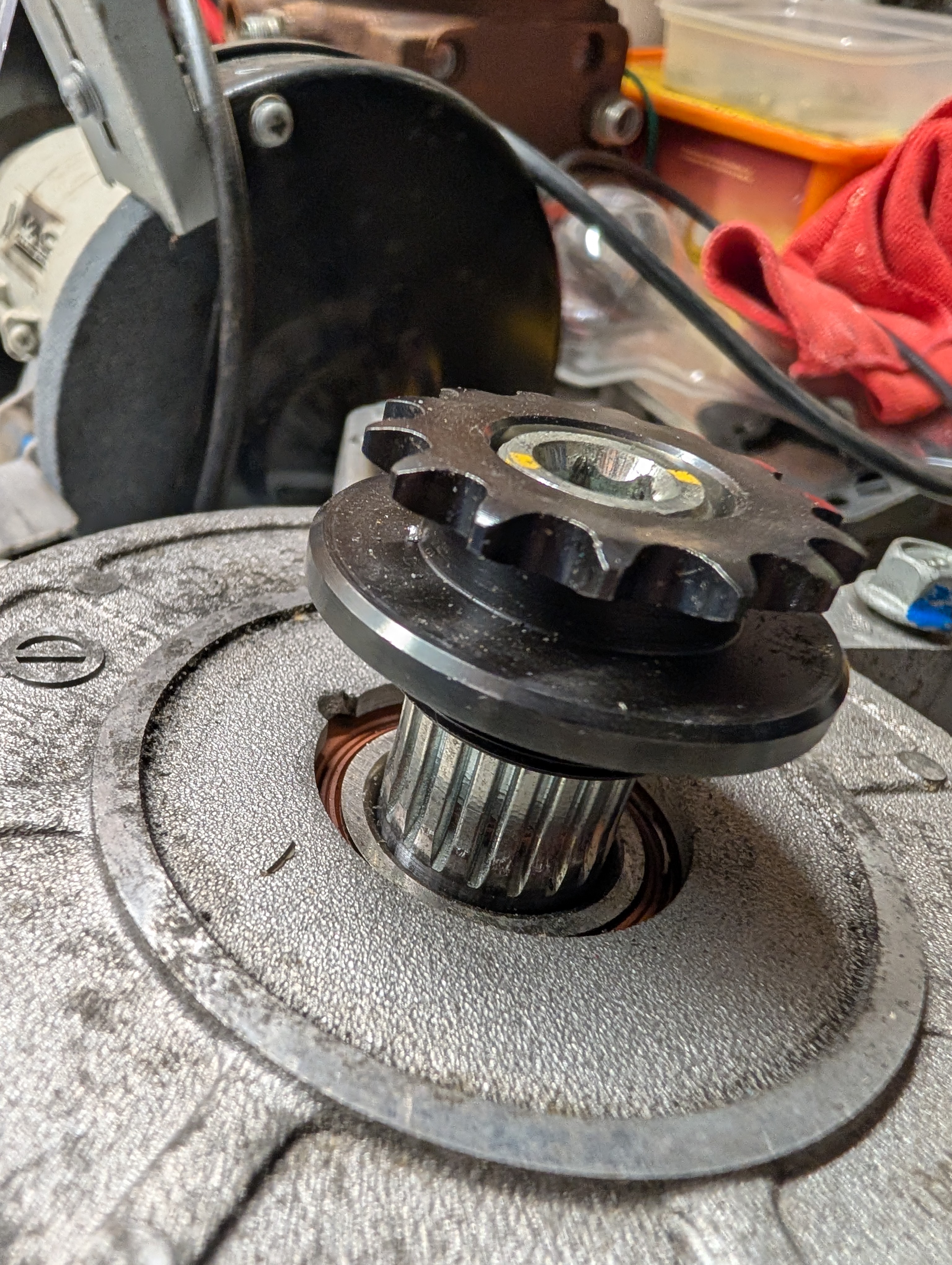 I machined down the standard pulley. Sprocket fits perfect on the shaft. Will weld sprocket to standard pulley core. Rough machining was done by spinning motor without field weakening, and using an angle grinder.