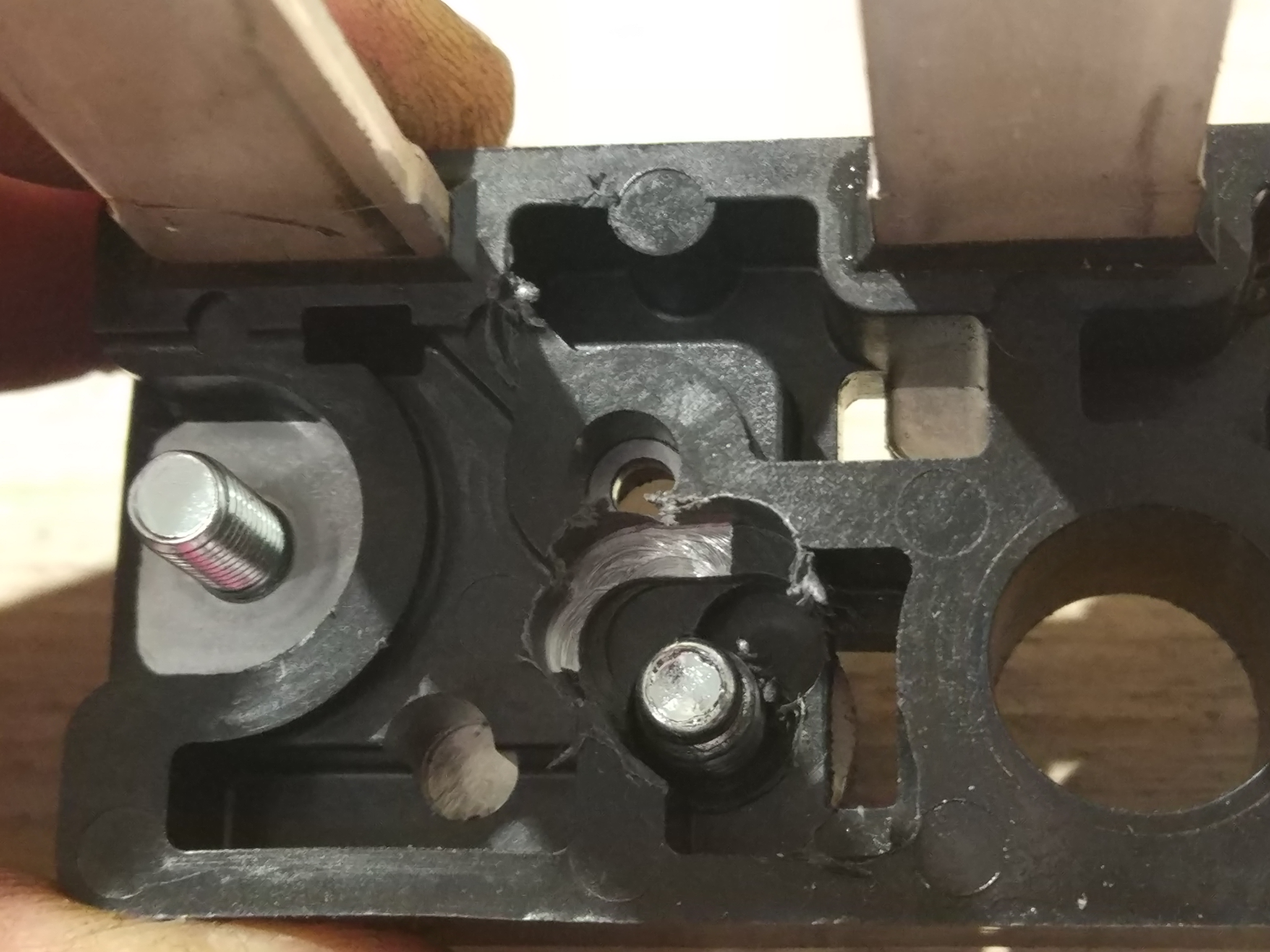 So everytime i drill out that i turn the plastic around and mill out that plastic to reveal where metal brace is. Then i mill a piece of it out. At least 2mm around bolt should be enough.