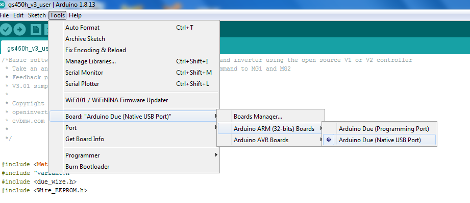 11. Select the Com Port. Go to Tools, Port, there should be a com port called something like Arduino Due Native USB Port. Select it. Once selected it should appear in the bottom right corner of the Arduino Screen. Again if it doesn't appear restart the Arduino Program and or the Computer/Laptop