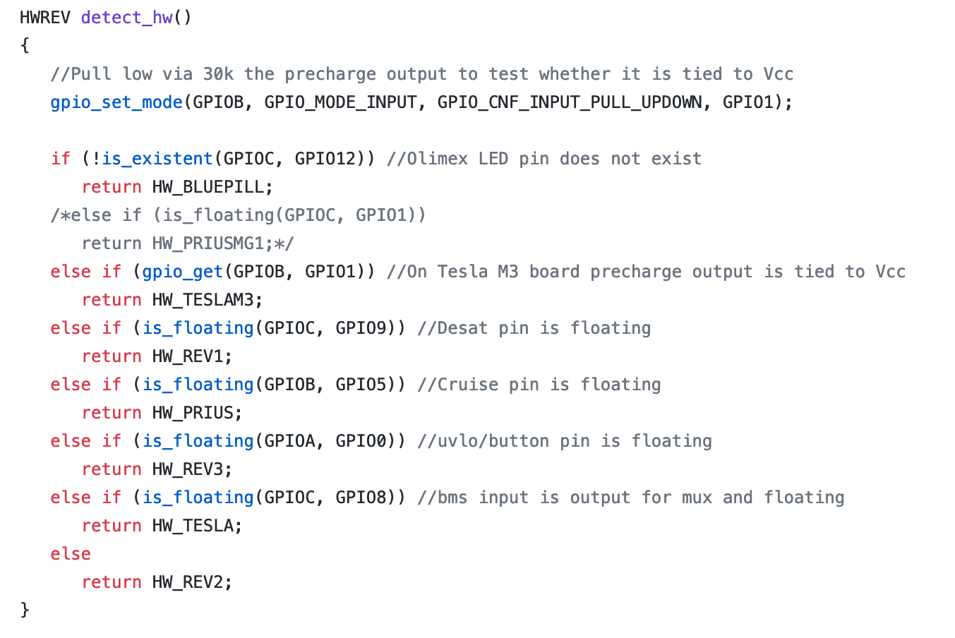 The program identifies "Mg2/Prius" by checking if output GPIOB, GPIO5 is floating. I had to remove R18 and C9 to get it floating.