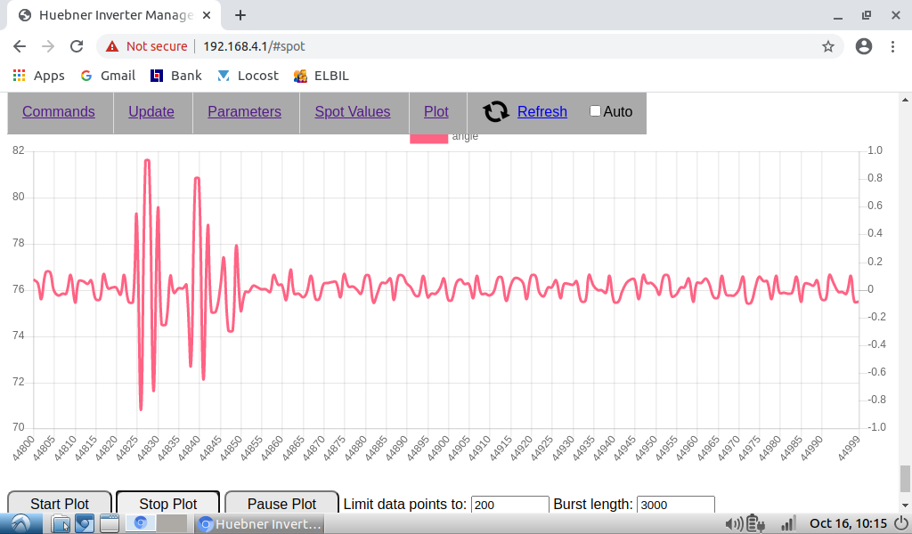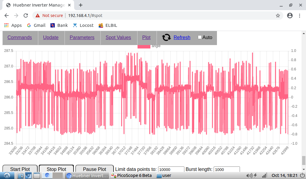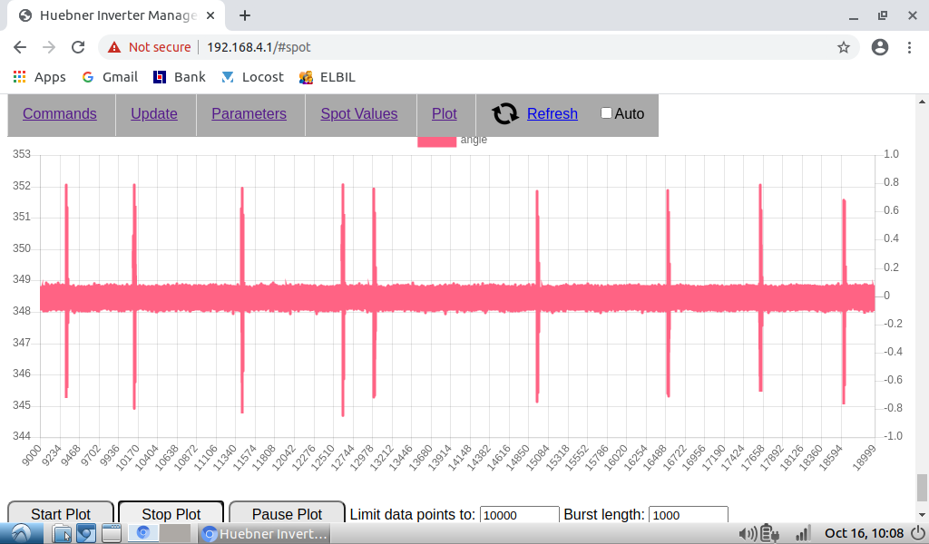 Regarding spikes in angle plot, to catch them I need to set 10000 data points and 1000 burst length. Then I catch them every time. With less data point I don't always find them.