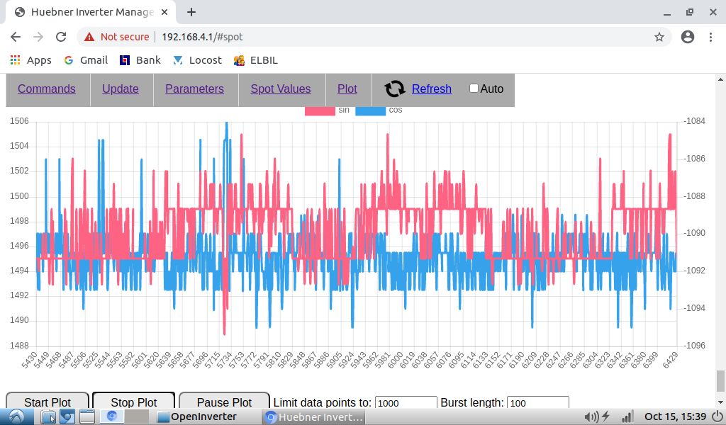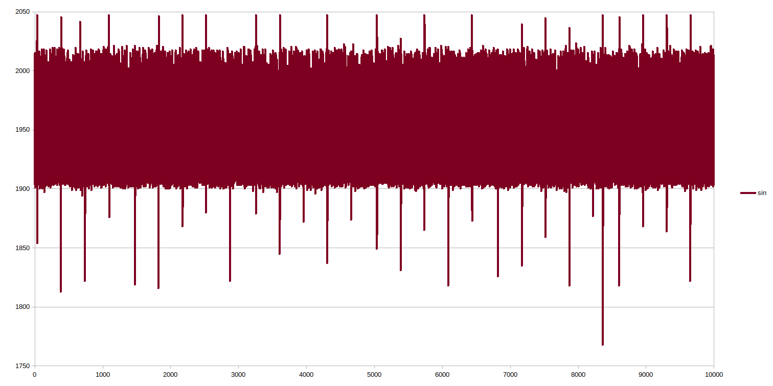 I did some measurements on pin PA7 with a 3.3V supply and a potentiometer feeding via a 10k/1nF 16kHz break off frequency filter. Then with 330r/1nF filter 482kHz break off frequency. And finaly with a 330r/30nF 16kHz break off frequency filter. Also another interesting finding. When having the oscilloscope probe at PA7 (sin) this is what angle plot looks like. And this is when the probe is at PA0. A hole lot more jitter when probeing at PA0, which is odd. Something is happening with this pin. However on the blue pill PA0 is also the throttle pot input which might mess it up a bit. I will pull my real board out of the inverter tomorrow to take better measurements.