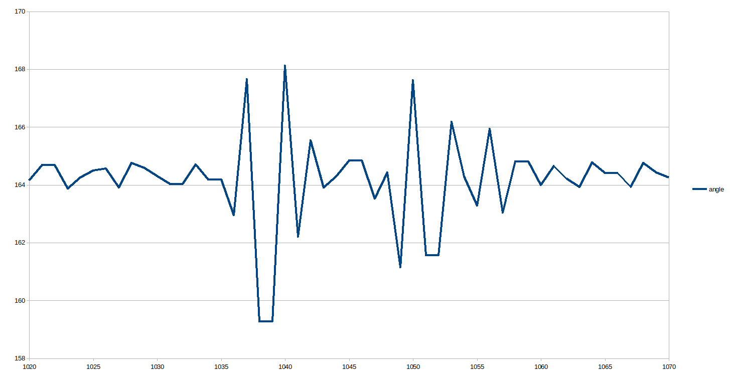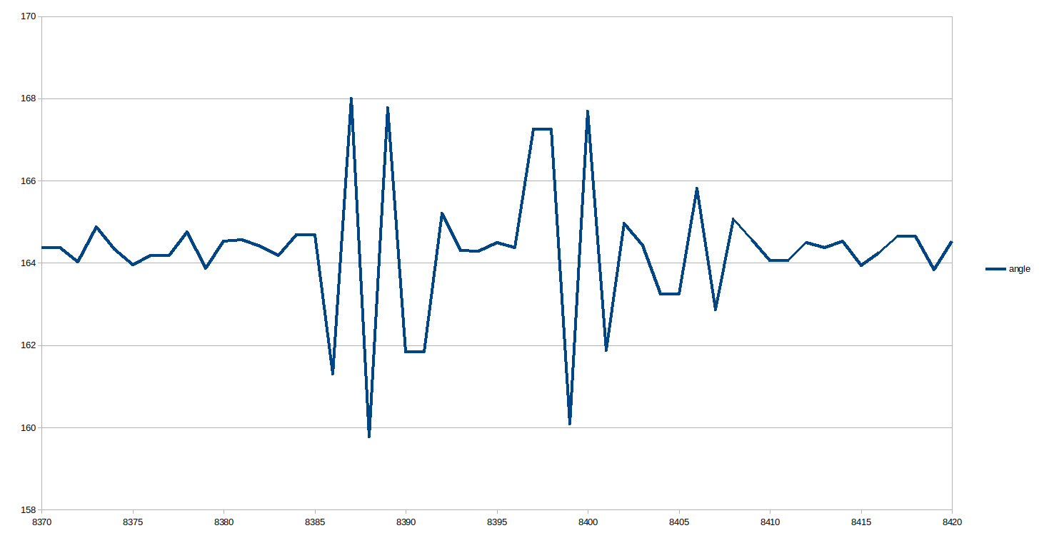 First only logging angle to sample every data point possible. Zoom at first spike. Zoom at 8th spike. Remember some points are logged twice, hence the flats.