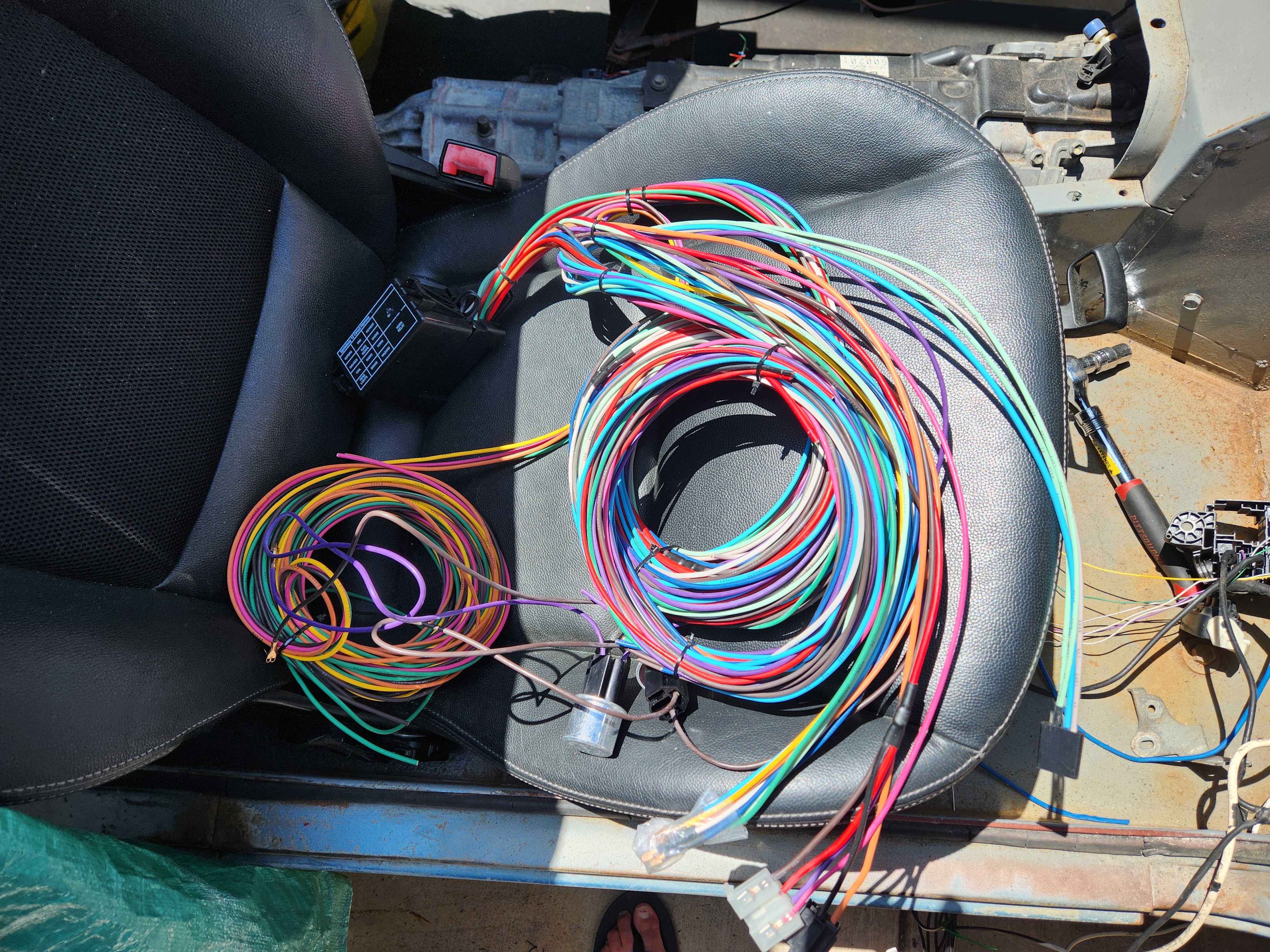 Wiring, wiring. I want to try and get as much wiring and plumbing done as possible before the battery goes in as the access is so good. Starting with the transmission wiring to Zombie and inverter to Zombie. The pre-wired Zombie connector from AliExpress is great, but the downside is that there is a ton of wire from the get-go which gets unwieldy to manage vs. doing one circuit at a time.