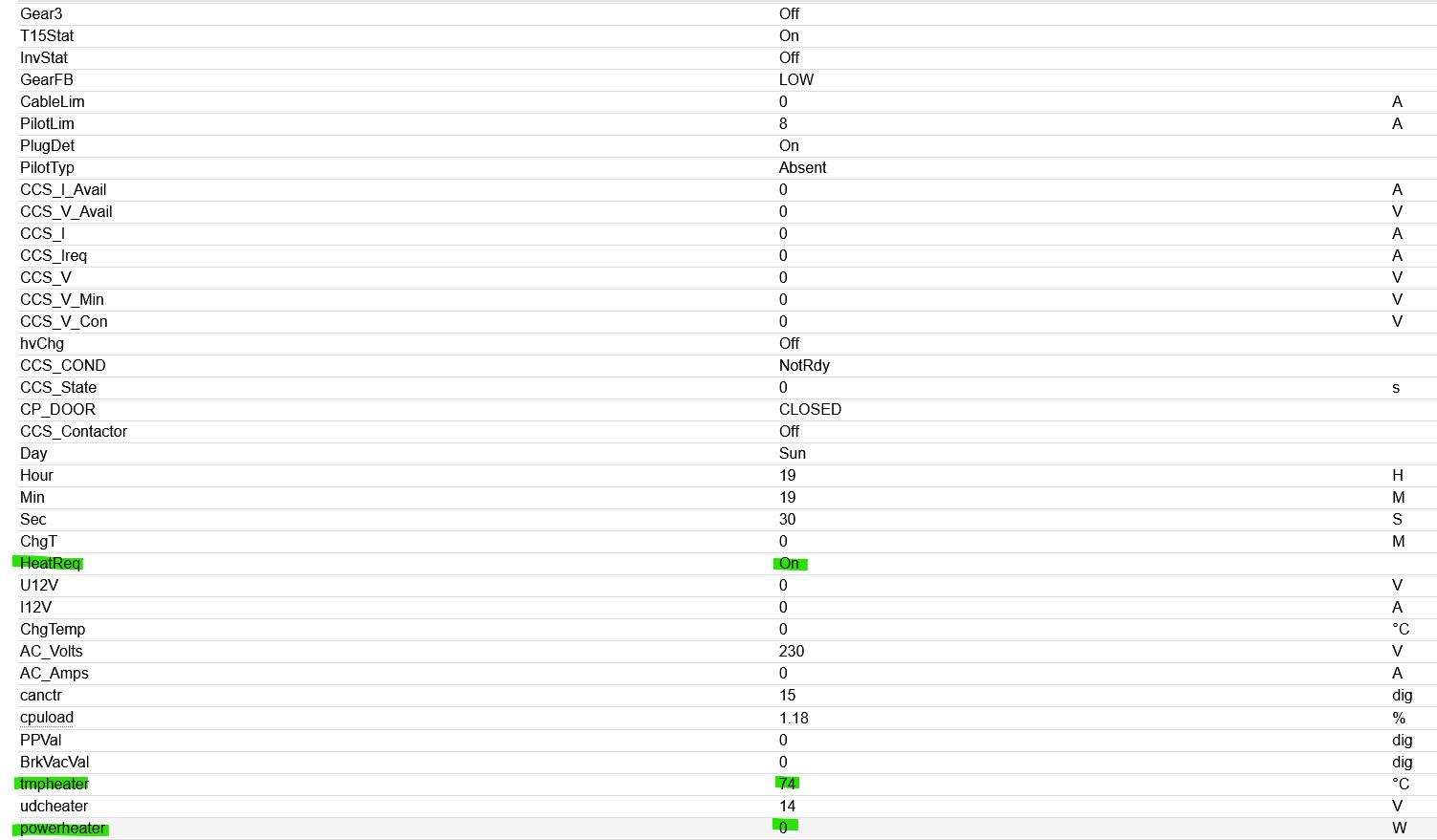 Heater params were VW, control enable, power 6500W and HeatPercent 100. I also used PB3IN as Heat request and that didn't seem to change things either. Tips are welcome