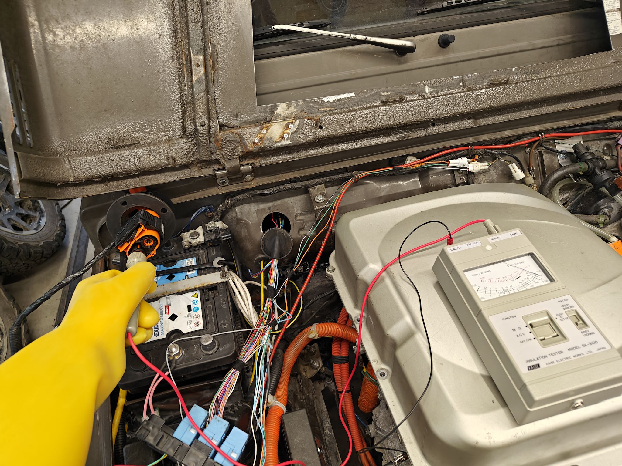 Prodded the HV connectors on main harness and VW heater as well as the charge ports. The analog gauge is not the most precise, but got tha ball park numbers that I could use for the report for initial inspection I'm writing for MOT.