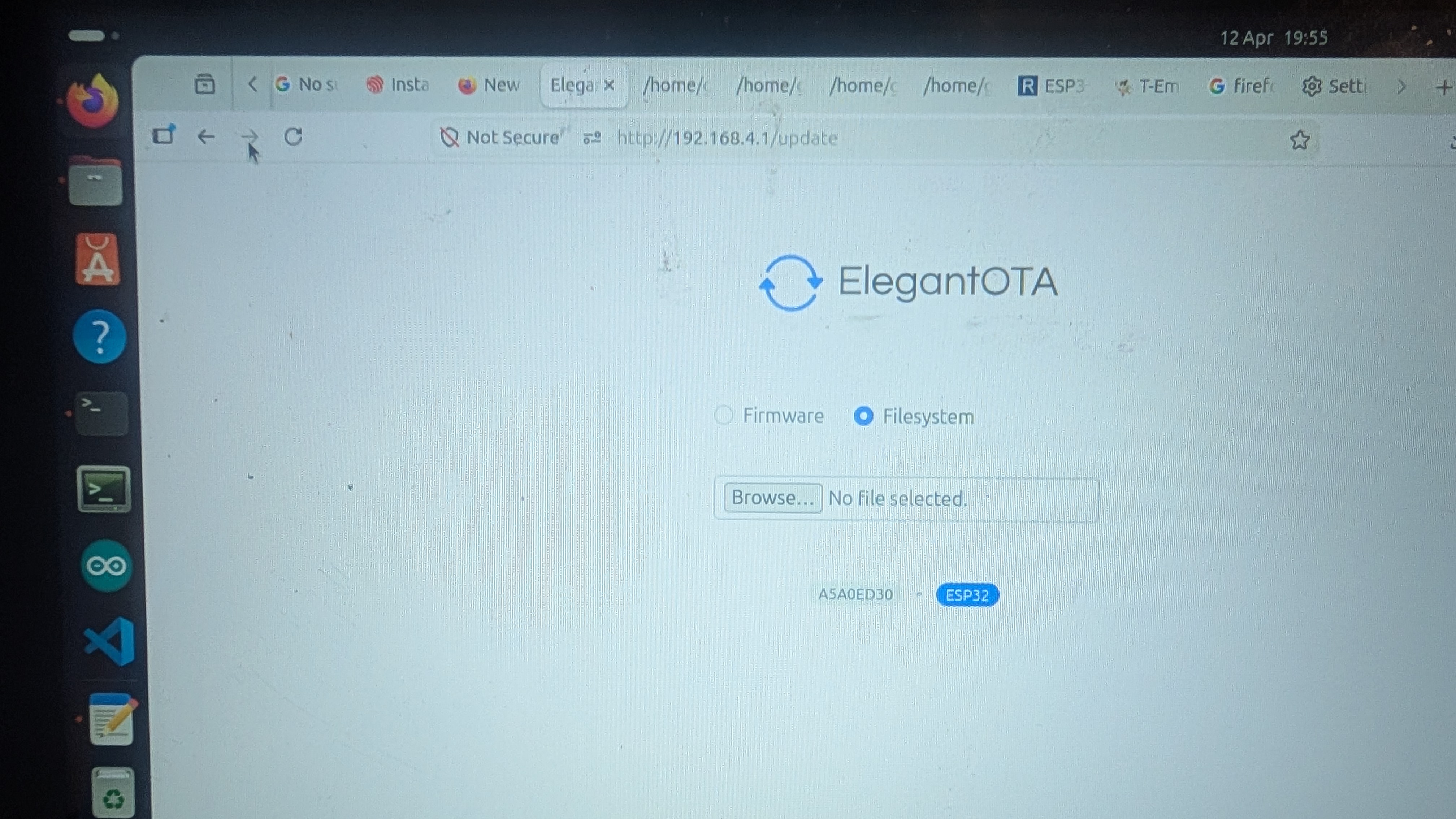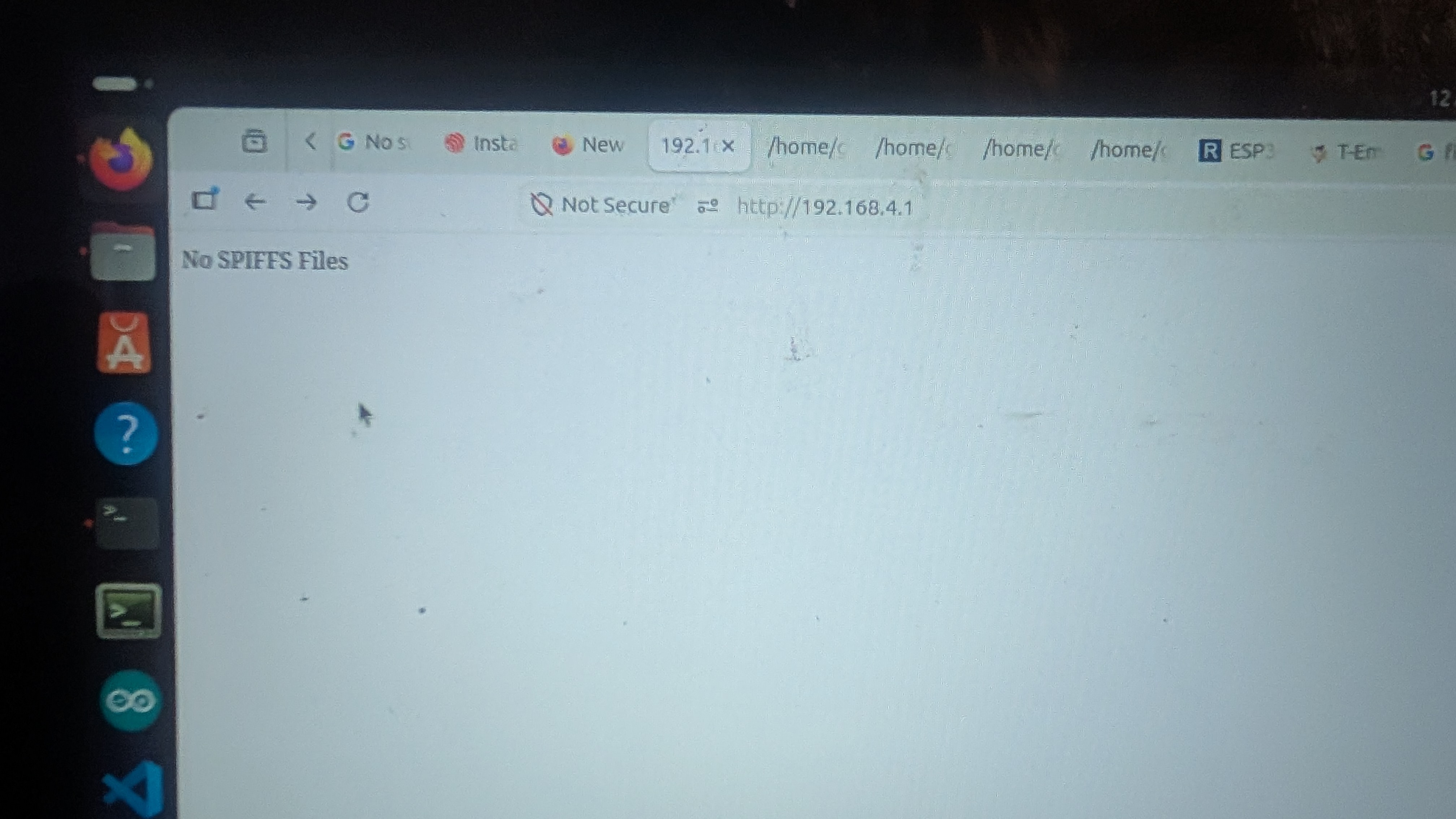 A bit more info, when I go to 192.168.4.1/update I can do OTA updates but none of the above files fix the "No SPIFFS Files" error. I had a look at the terminal output, shown below and noticed several warnings.