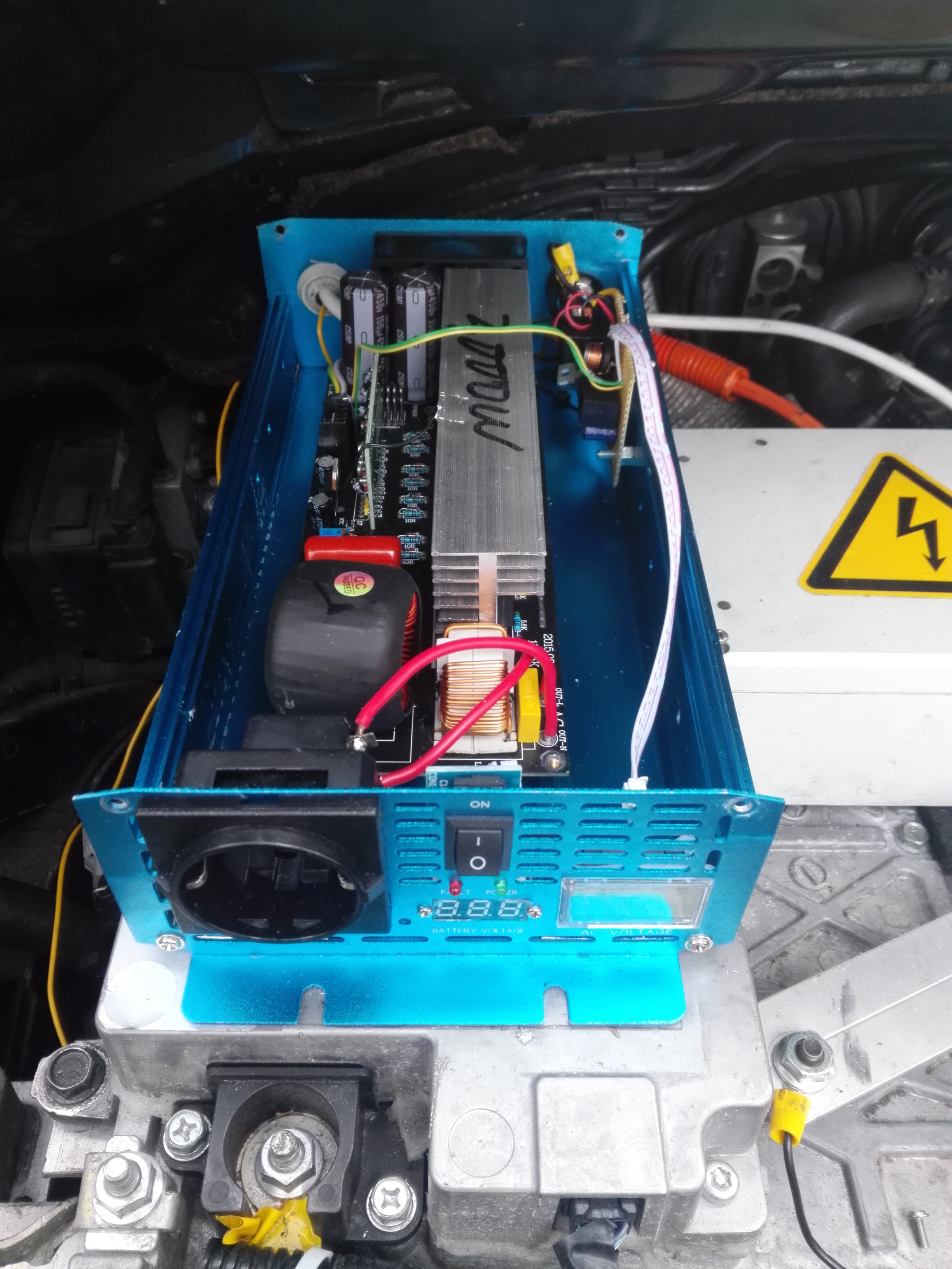 Took Touran to our summer weekend to supply it with electricity. Aaaand - no voltage coming out of Chinese inverter. Ok, returned home, removed the PCB and found the two elcaps rather swollen. Indeed, 0 uF, totally blown. Supposedly "Nichicon" - yeah right. Replaced them with a proper one aaand - still no voltage. Hmm. Wiggled the sine filter coil a bit to find both legs had broken off. Little surprise there actually, it is really heavy and only held down with cable ties.