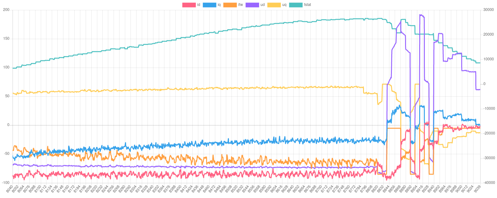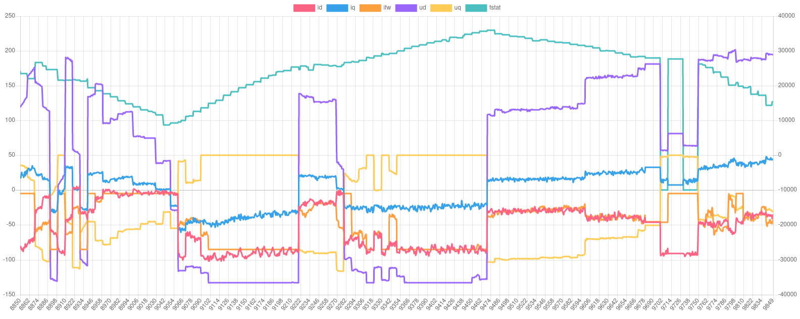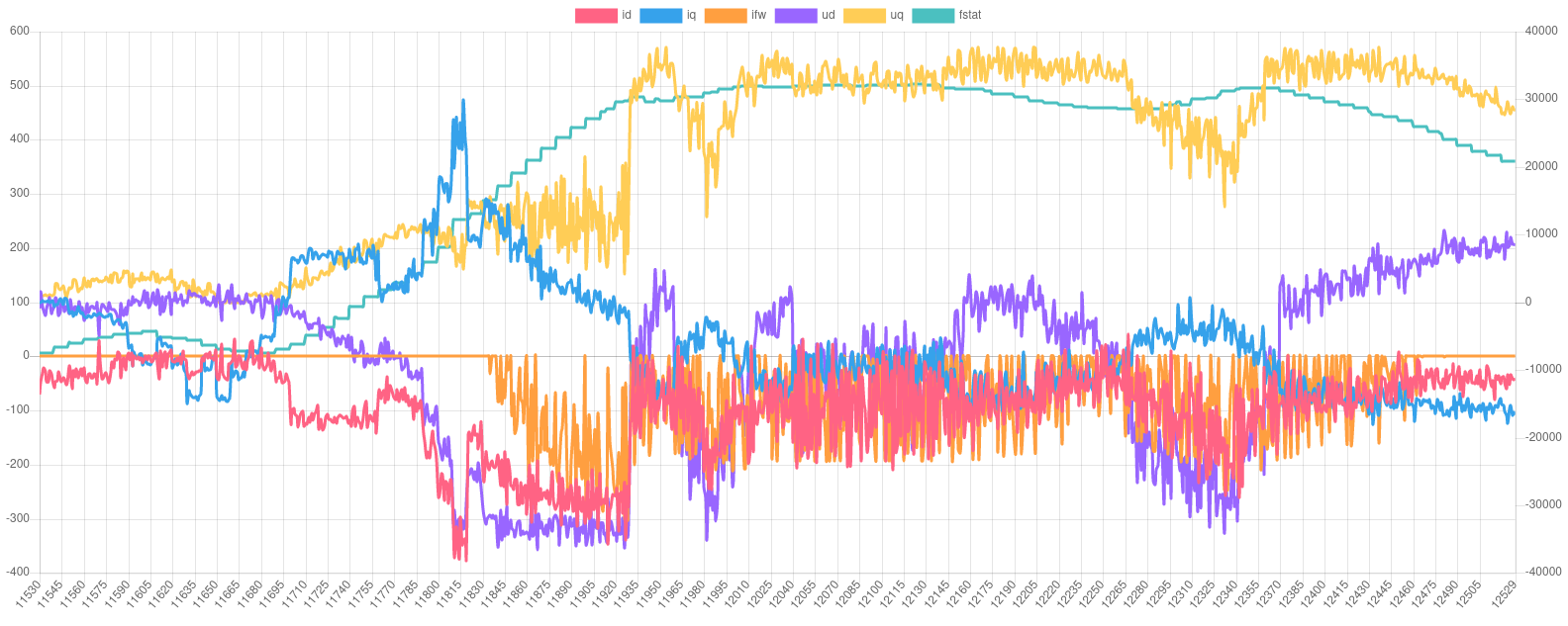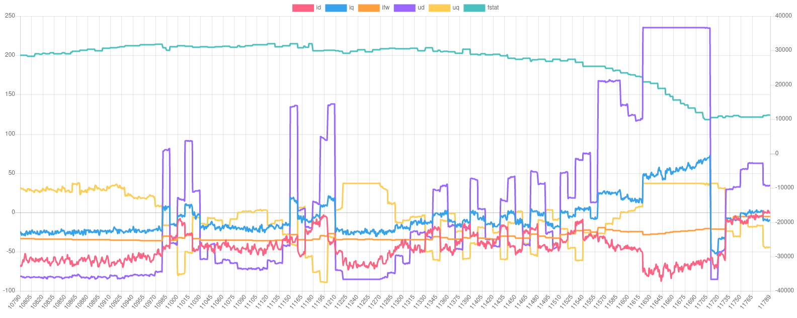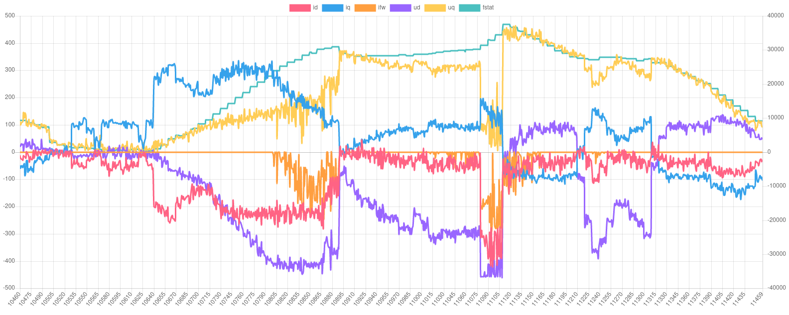 EDIT2: while off-throttle regen was disabled brake pedal regen was still enabled. So at the end of each run you see positive iq. And then ud suddenly changes sign and has much higher magnitude. So the two are very closely coupled. That's probably what "dq decoupling" is useful for.