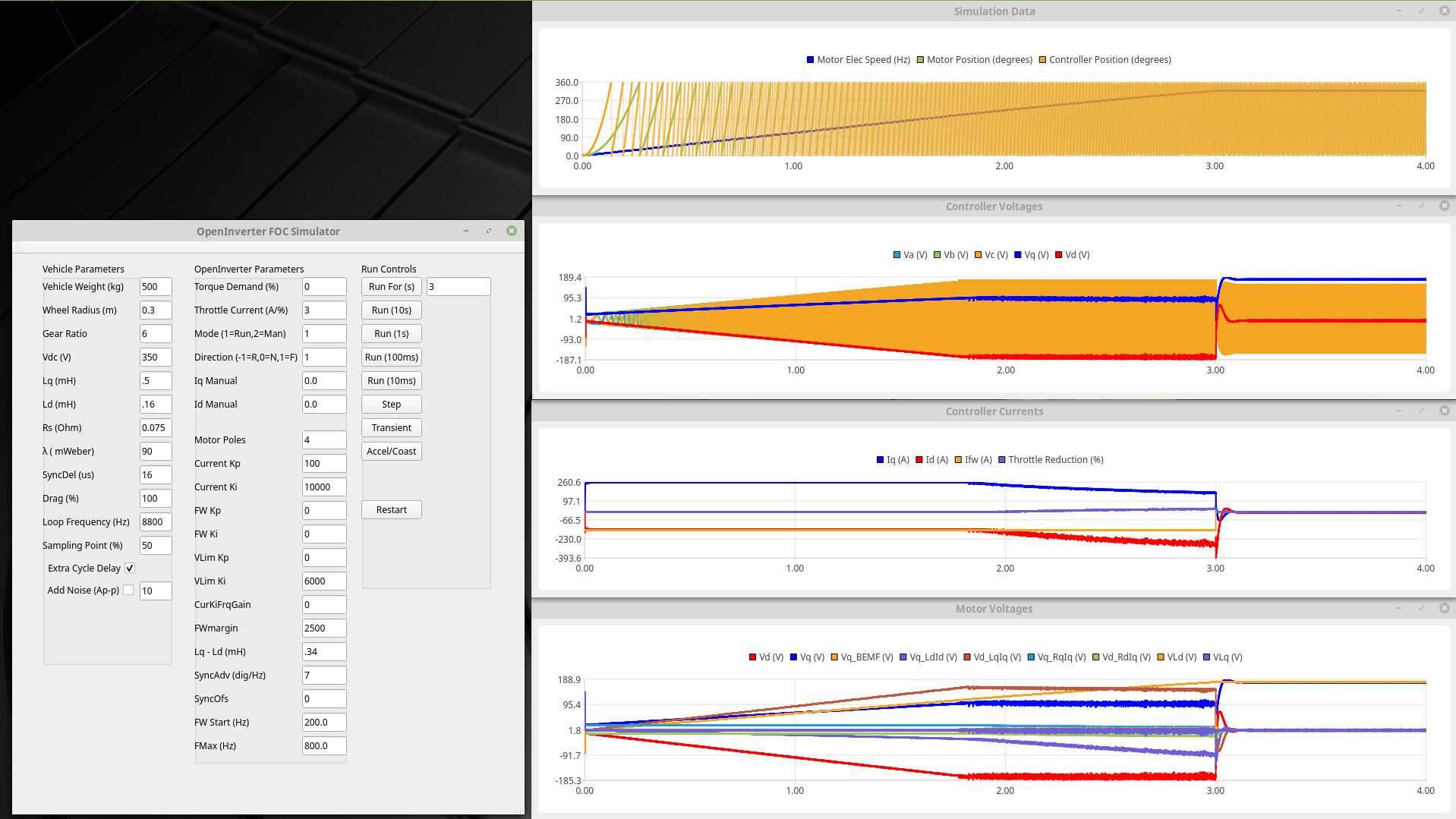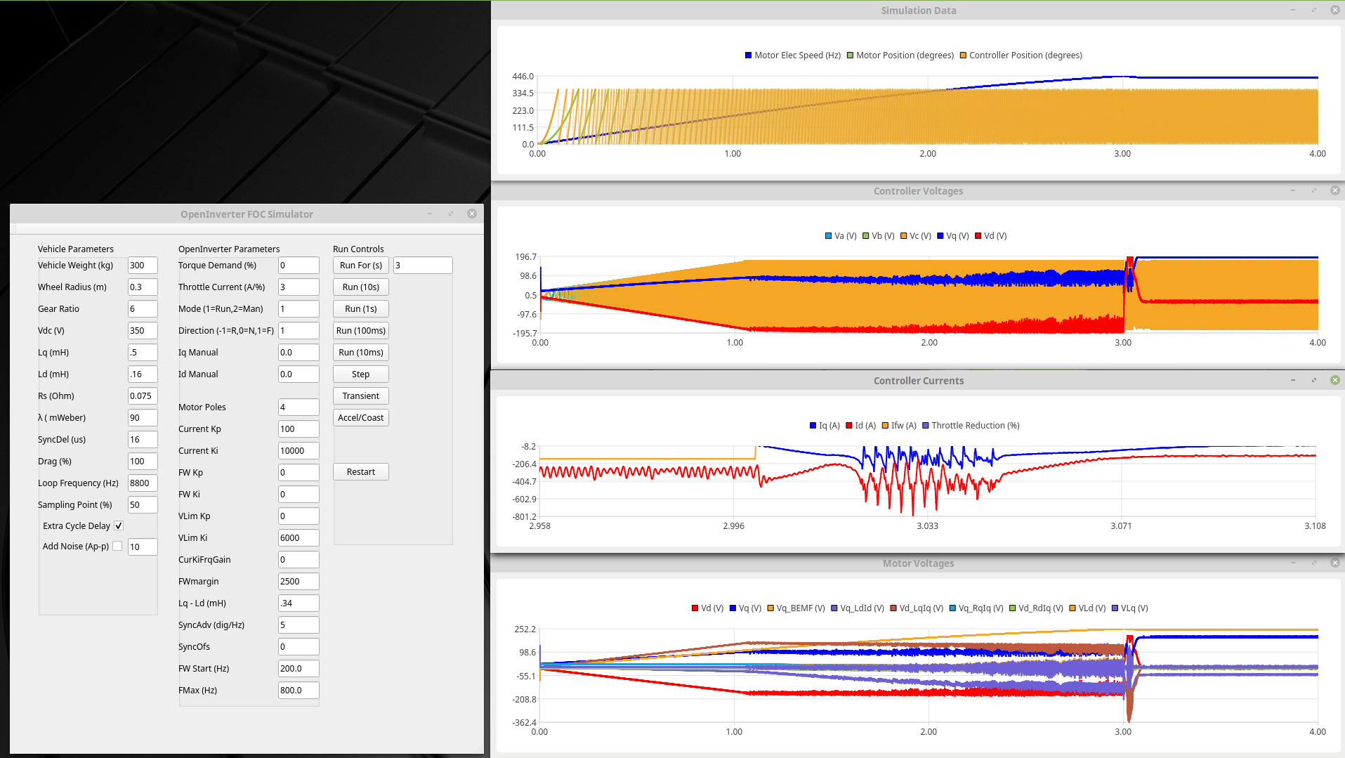 Id is around -333A while accelerating and changes to -140A when coasting to maintain control of the bemf (bemf of 250V reduced to the max inverter voltage of 190V). There is a bit of oscillation during the transition suggesting there is still a bit of work to do on the controller gains but overall not too bad :)