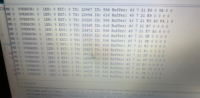 Whilst sniffing traffic from Clara and trying to get my head around the ESP32 Web interface tool I note that Clara broadcasts two CAN message IDs, as shown below. IDs 0x596 and 0x616. What are these message please?