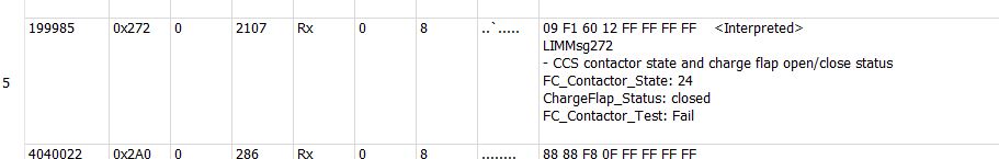 The .dbc has an anomaly for 0x272 (626). The signal FC_Contactor_Test is defined as big-endian (Motorola, etc.) when almost all the other signals in the .dbc are defined as little-endian (Intel, etc.):
