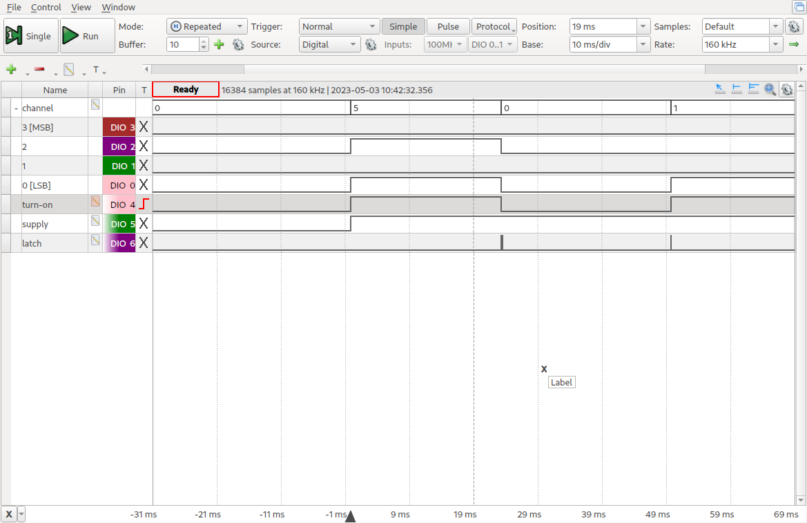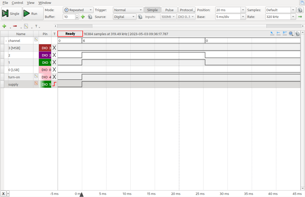 And finally, yes there is quite some blanking time between the switching (50 us iirc). I have attached a logic analyser to 16 out of 17 control signals and that works fine.