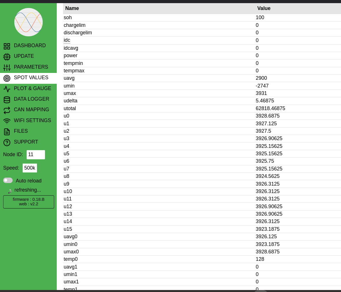 You can see the issue at 2:43 and 4:09—umin drops to -3.9V or 0mV, even though there are no cells with 0mV or negative values reported. Delta also reflects these incorrect values. In charts, I see some kV readings or 0V spikes.