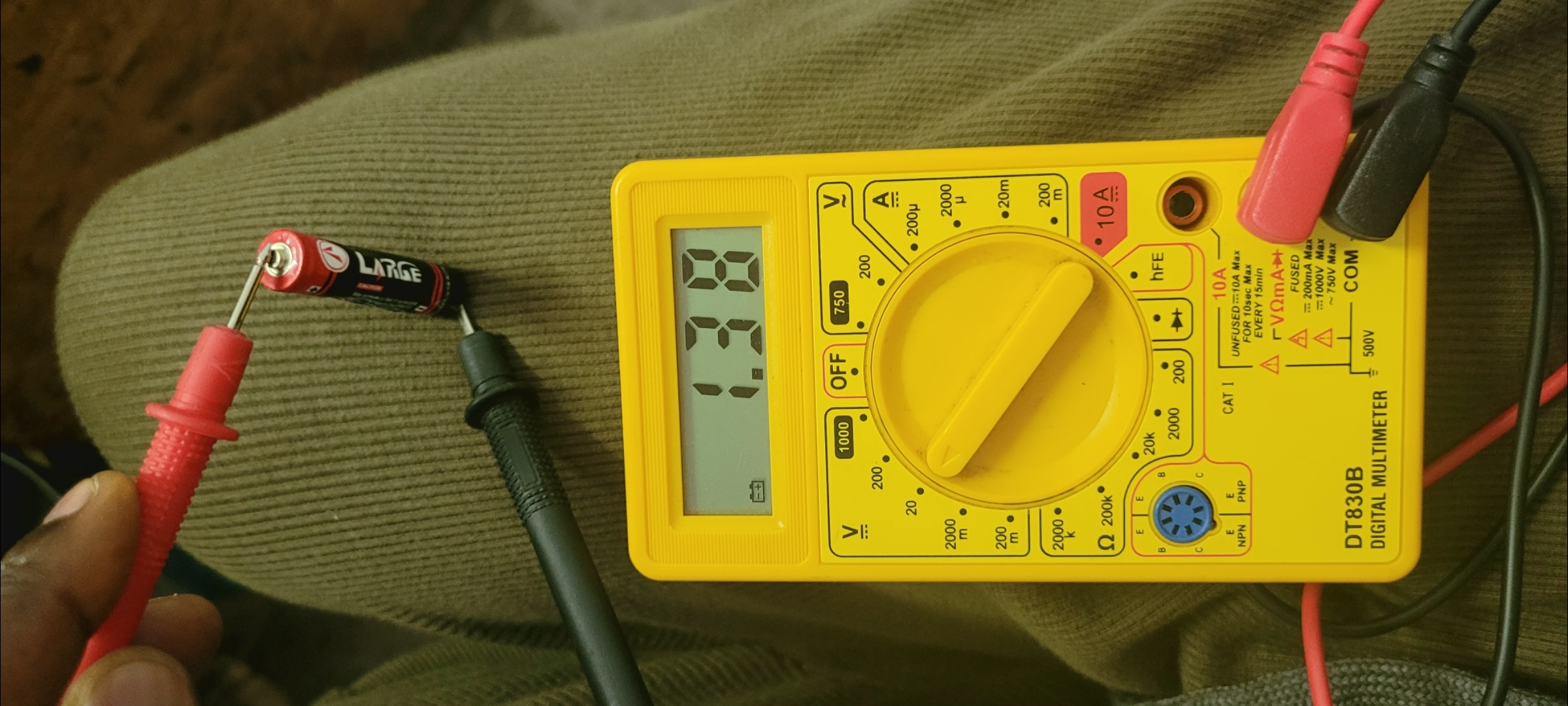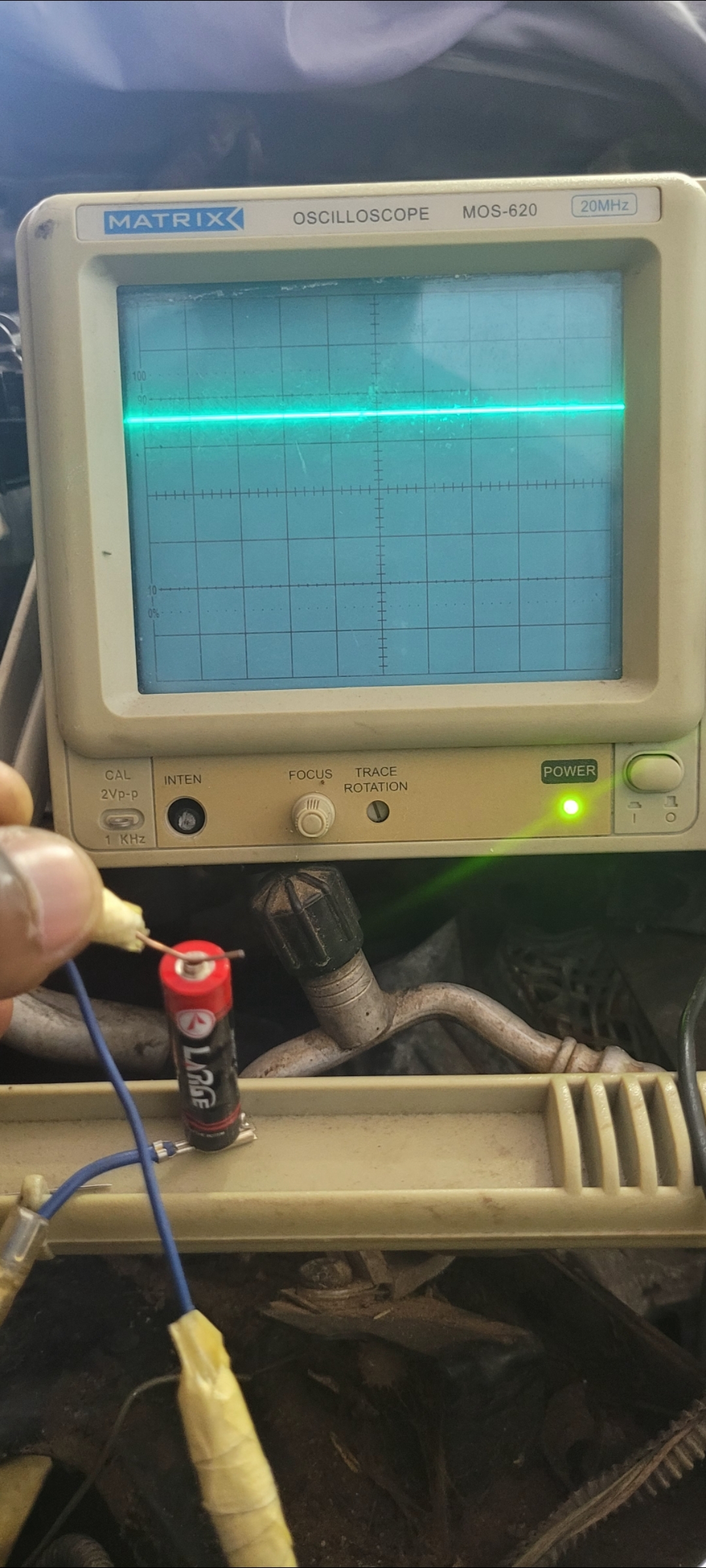 On the tutorials they helped me test the probe using the 2vp-p 1kHz test on the left bottom corner of my scope. And I was able to get a proper square wave from dc. Then I went on to test a 1.5v AAA battery.