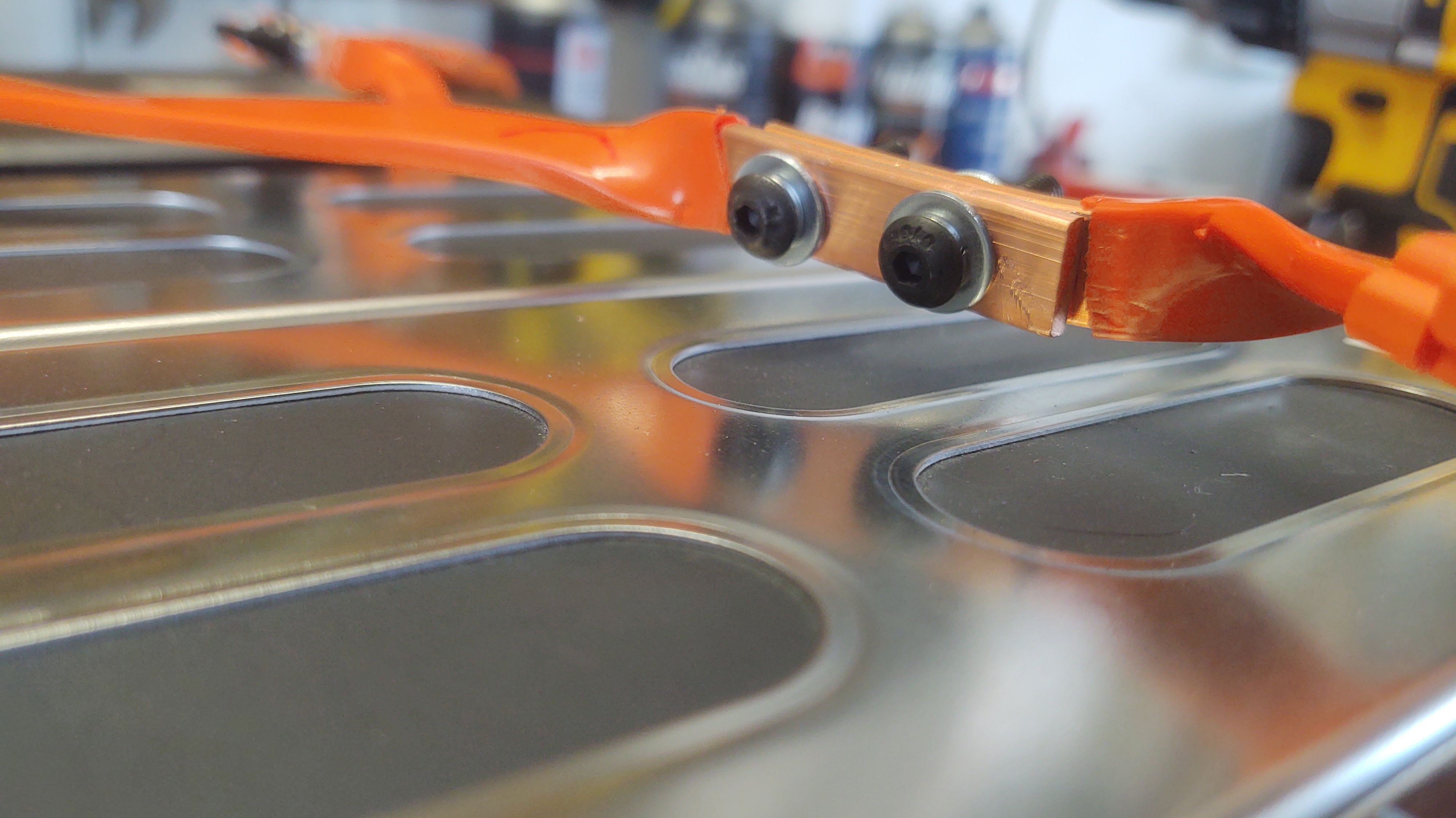I bought a bag of M5 high tensile 10.9 bolts and I think the nuts are 8.8. I used spring washers on both sides as I am a little concerned about the copper crushing and loosening over time and I have some lock nuts to put on to prevent the nuts loosening.