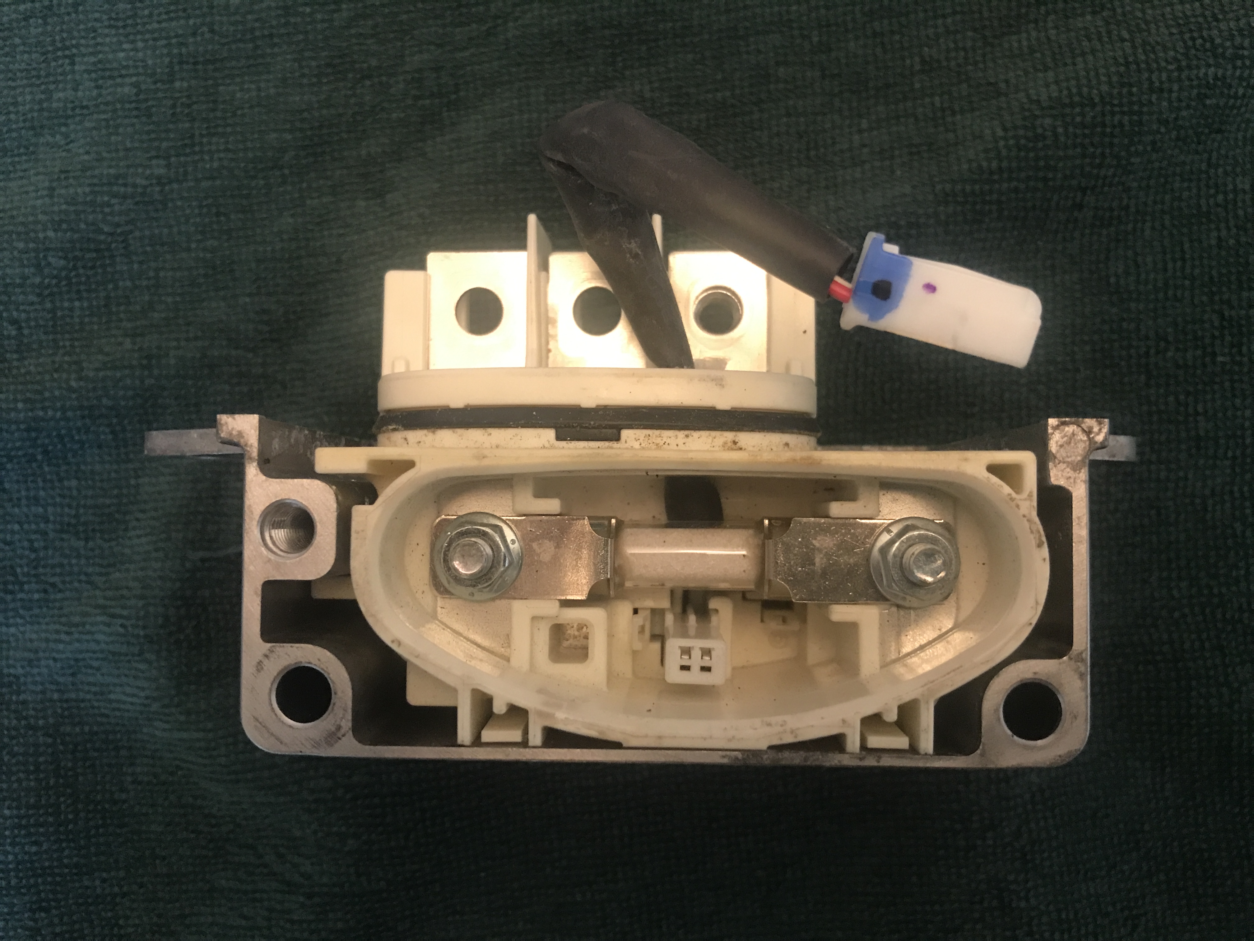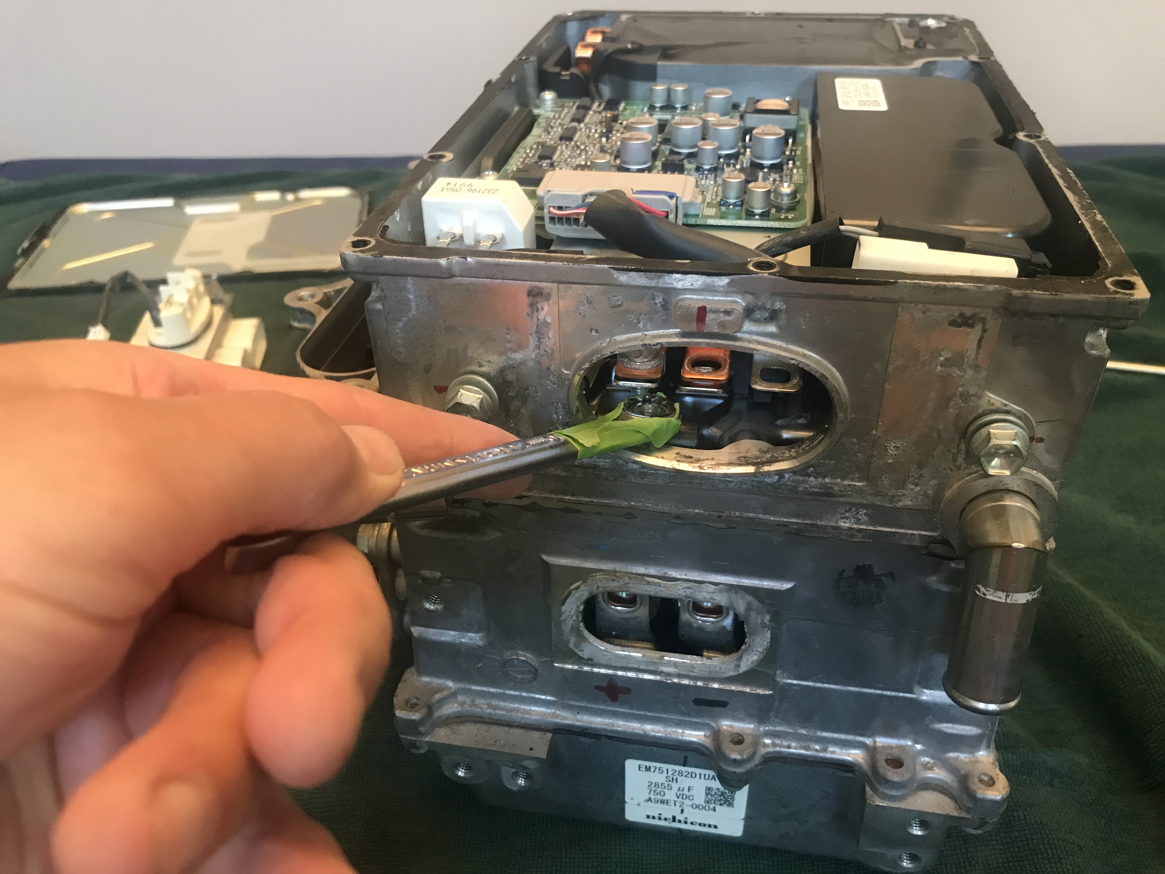 with that connector removed the bus bars need to be rebolted together, I used the old painter tape trick to keep the 10mm nut from falling into the abyss