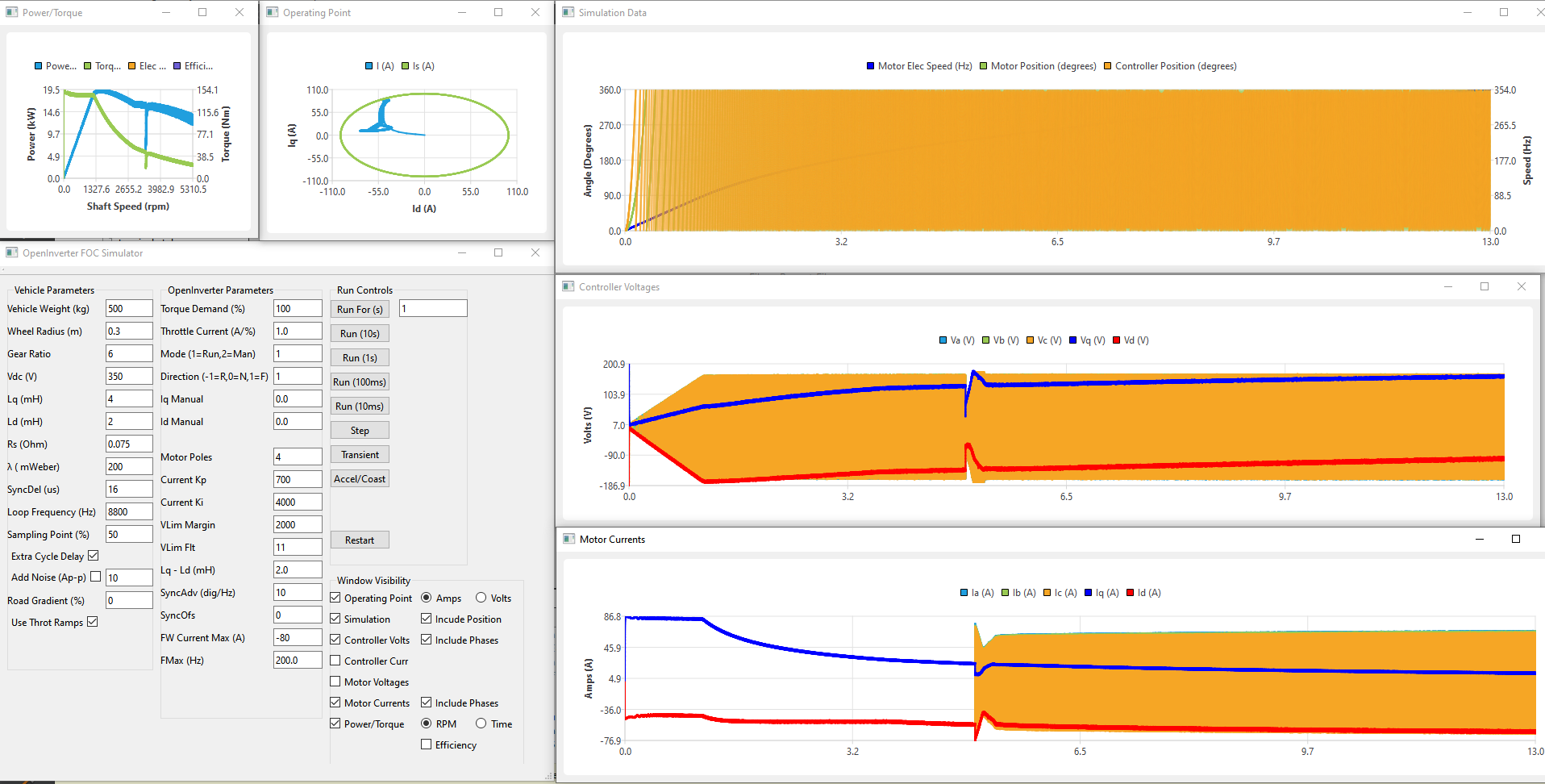 There are a couple of things that don't quite look right though. In particular the discontinuity you have at around 5sec and the sudden appearance of the phase currents in the Motor Currents graph at that point. The trajectory on the Operating Point graph also looks wrong.