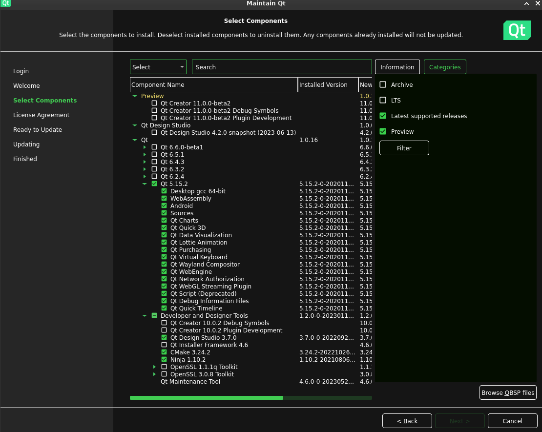 When installing QT it seems the installer has changed from what it was when the guide was written. The options that seem closest to what is mentioned on the install guide are as pictured...