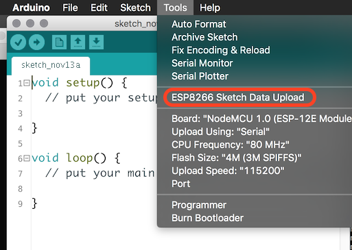 1) Connect to ESP WiFi and choose Port as IP 2) Install Arduino SPIFFS Uploader plug-in