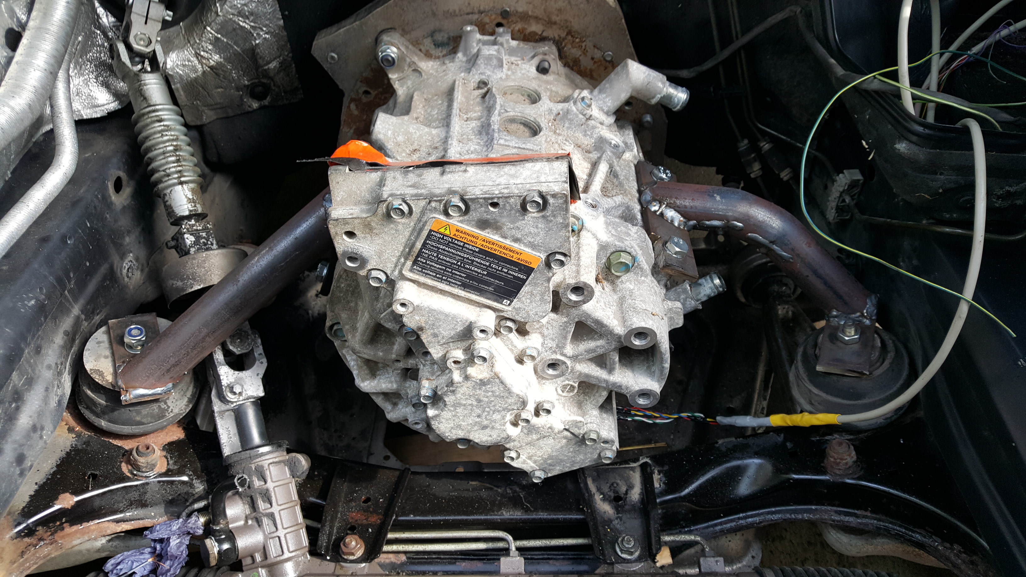 Some more progress. Motor now mounted and have started mocking up the positioning of the Lexus inverter.