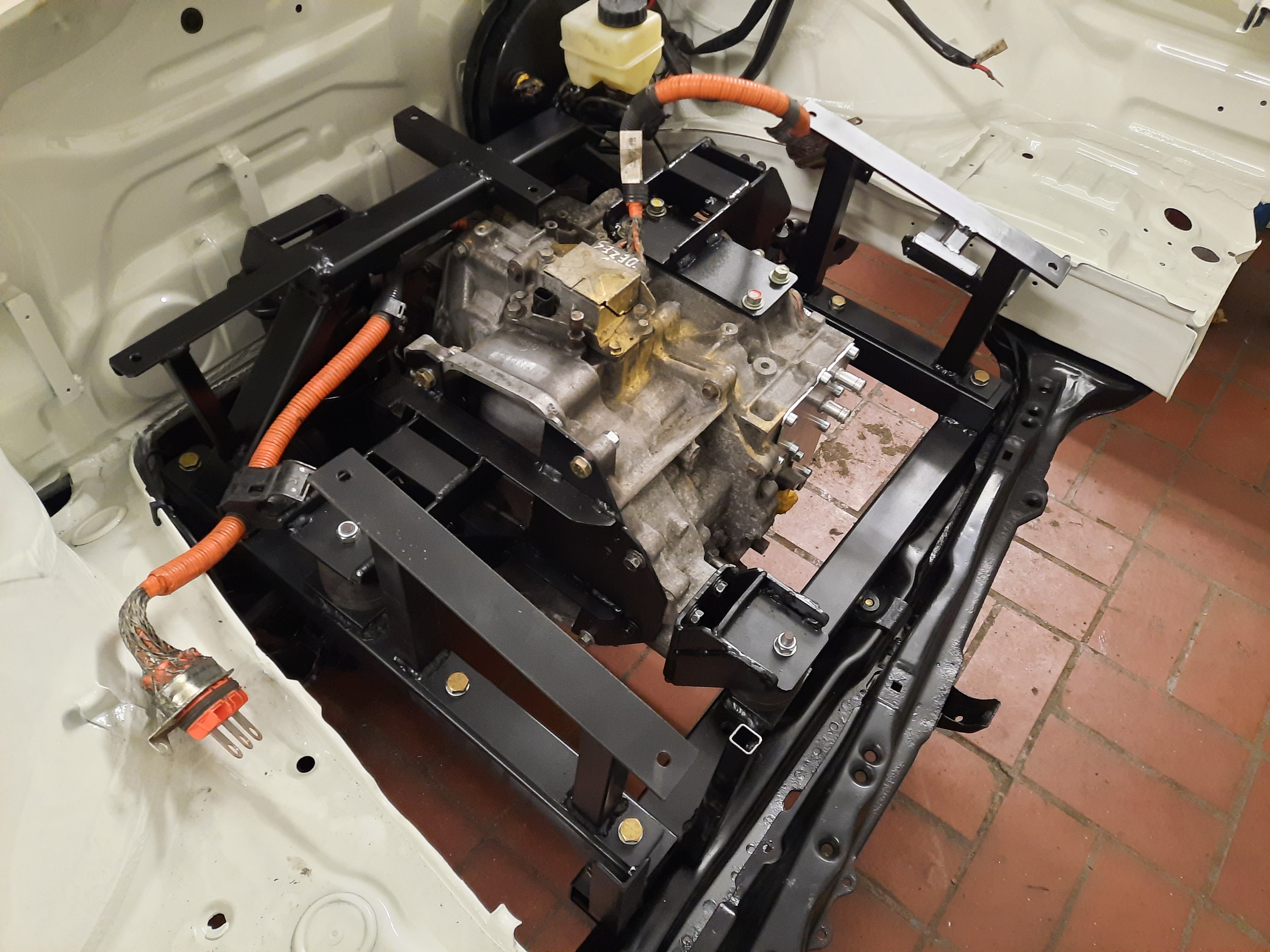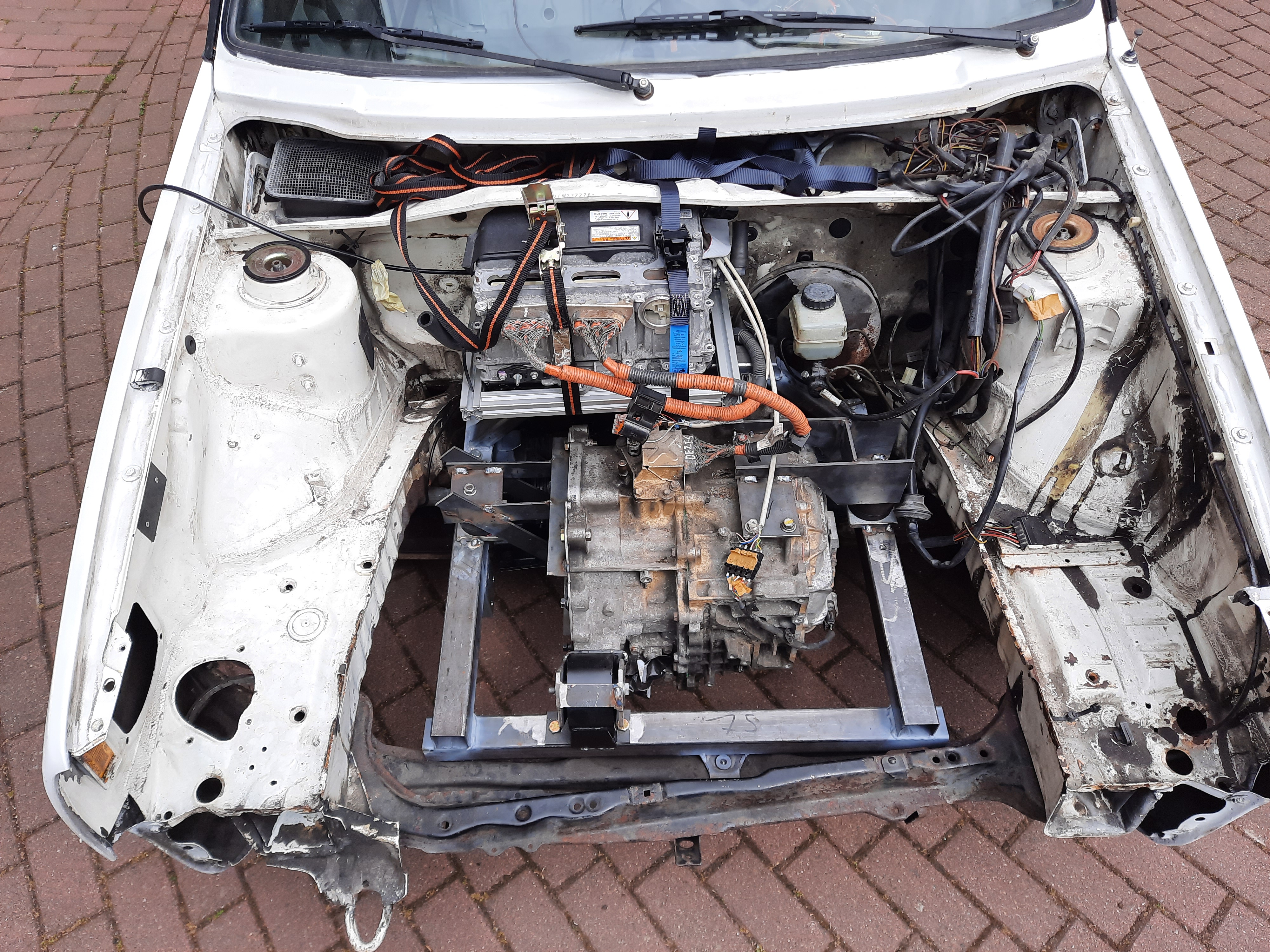 My plan is to convert a Golf 2 using a Prius Gen 3 motor and inverter. The motor (with a welded PSD) is already mounted in the car, the drive shafts are modified to fit into the Golf/ Prius mounts and the inverter is temporarily fixed with some strap clamps: