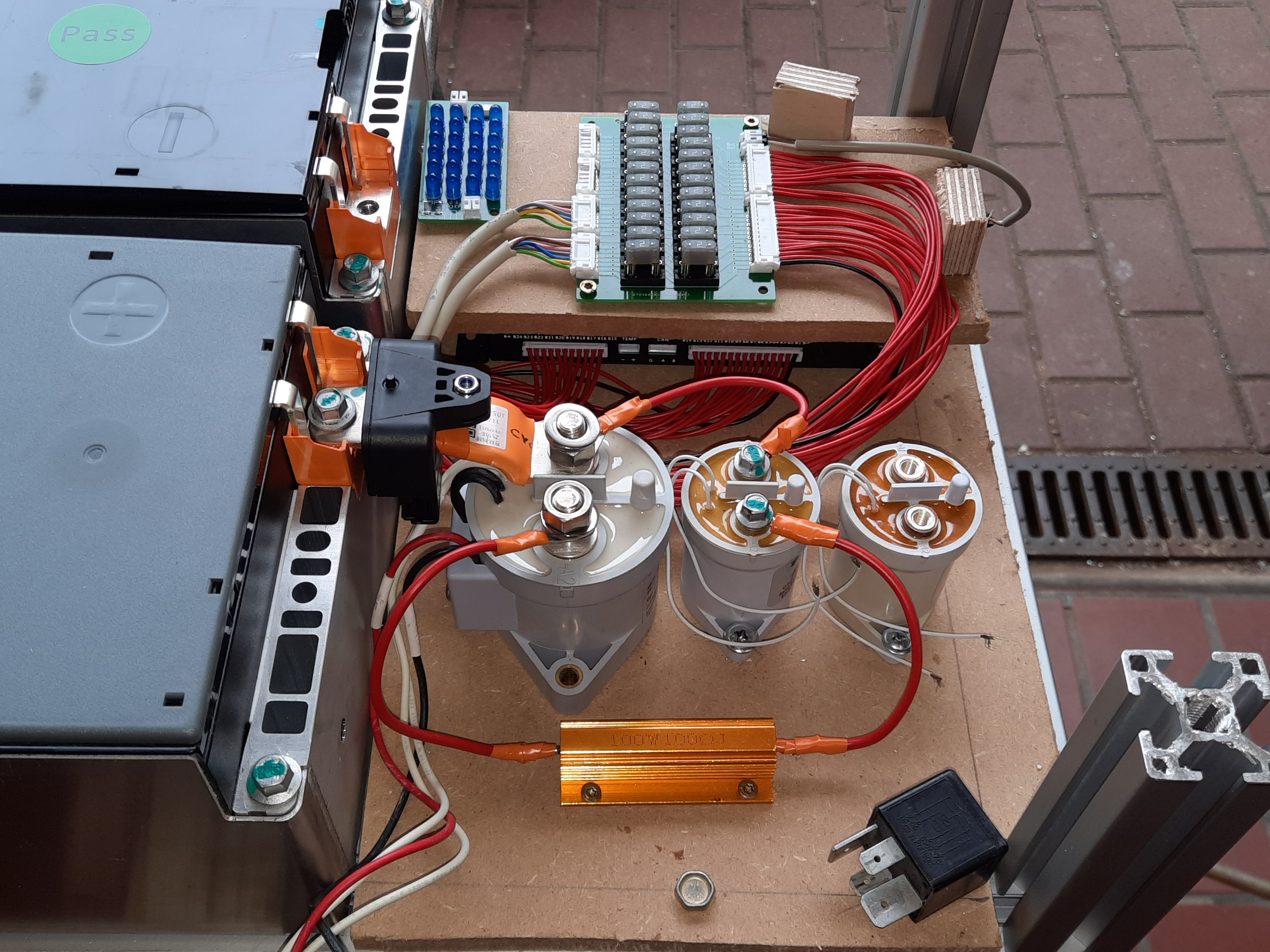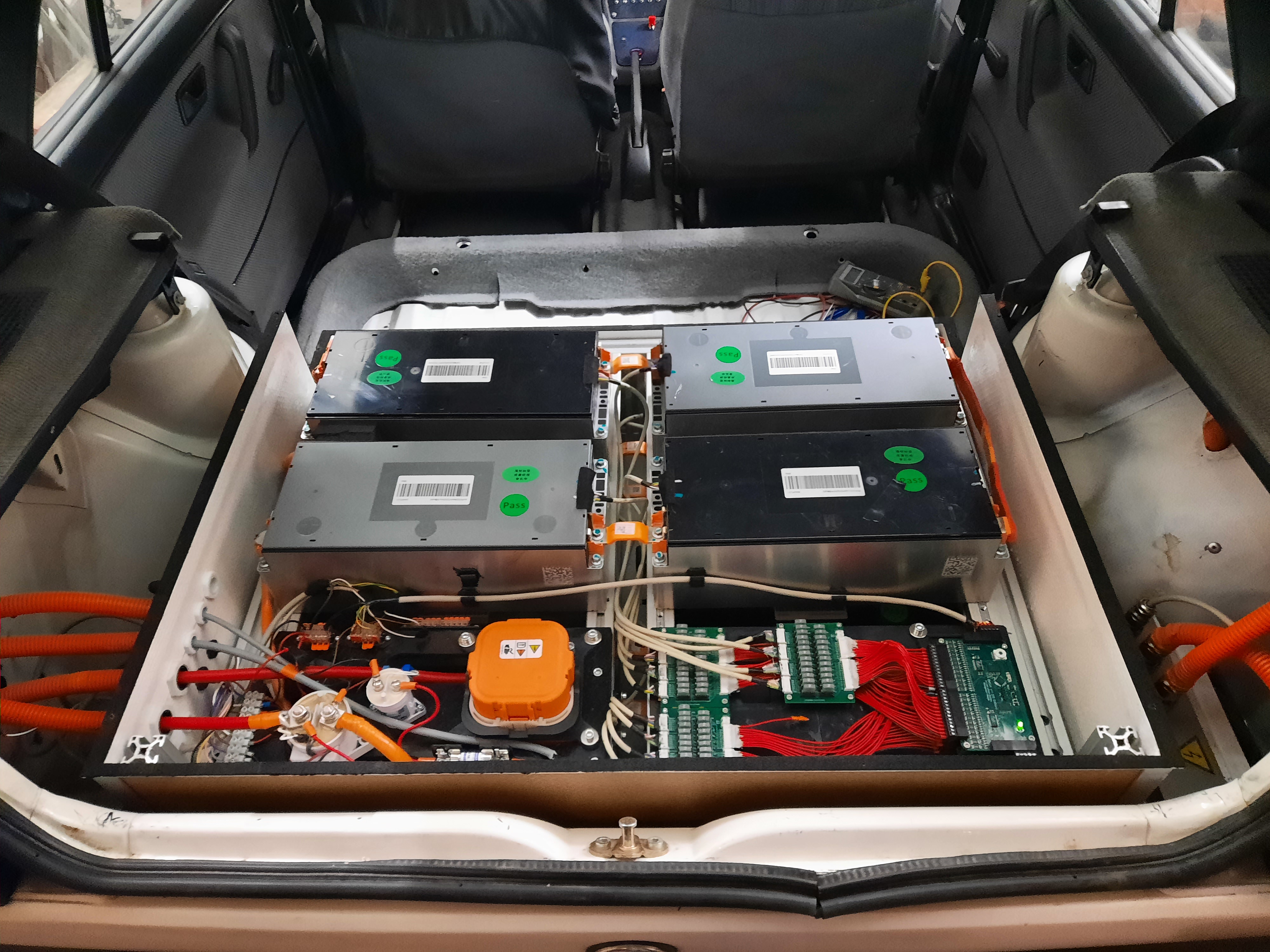 The next step will be implementing the real HV battery, 16 of the 18 modules from a MG ZS EV. This makes it a 96s system with ~40kWh. 4 of those modules will go into the front, the rest in the trunk.